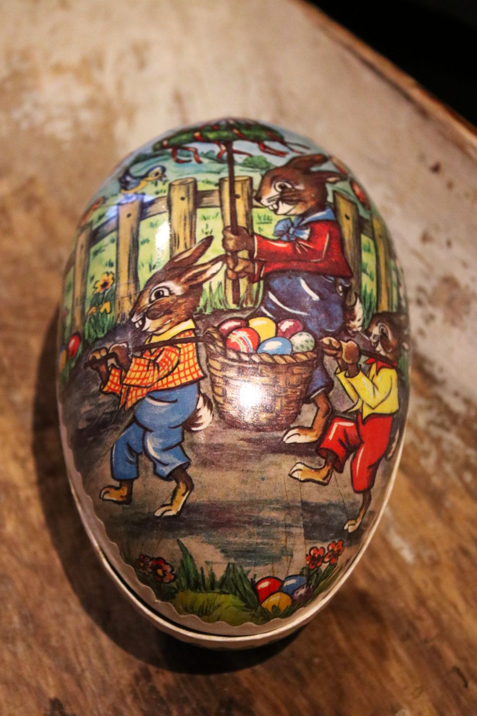 Gammelt vintage påskeæg i papmache med motiv af påskeharer der samler påskeæg...