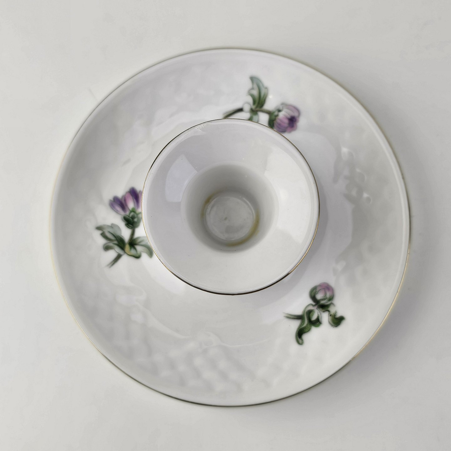 Krysantemum er hvidt porcelæn dekoreret med lys lilla blomst, grønne blade og guldkant.