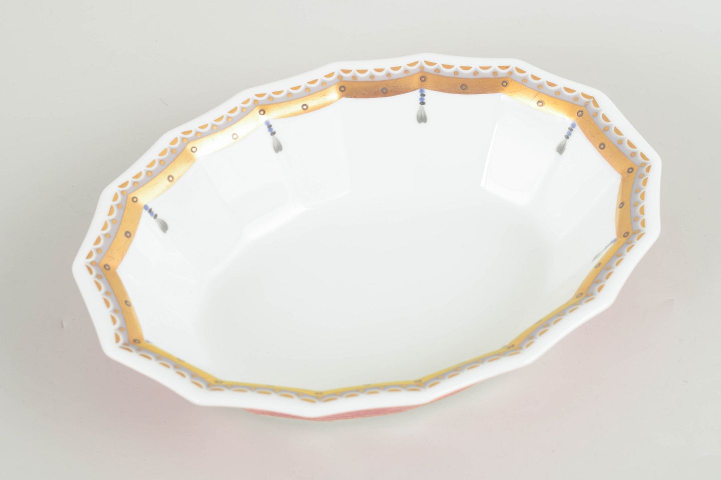 Low, wide bowl in white porcelain decorated with the Fairytale pattern in soft pink and golden tones with delicate ornamental detailing. This model was produced between 1992 and 1999 and is of first factory quality. Model 579.