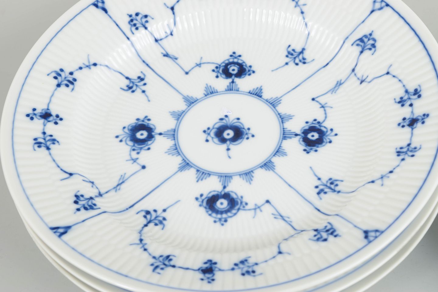 Sæt på 4 middagstallerkener i hvidt porcelæn med håndmalet koboltblå musselmalet riflet dekoration. Model 1/175.
