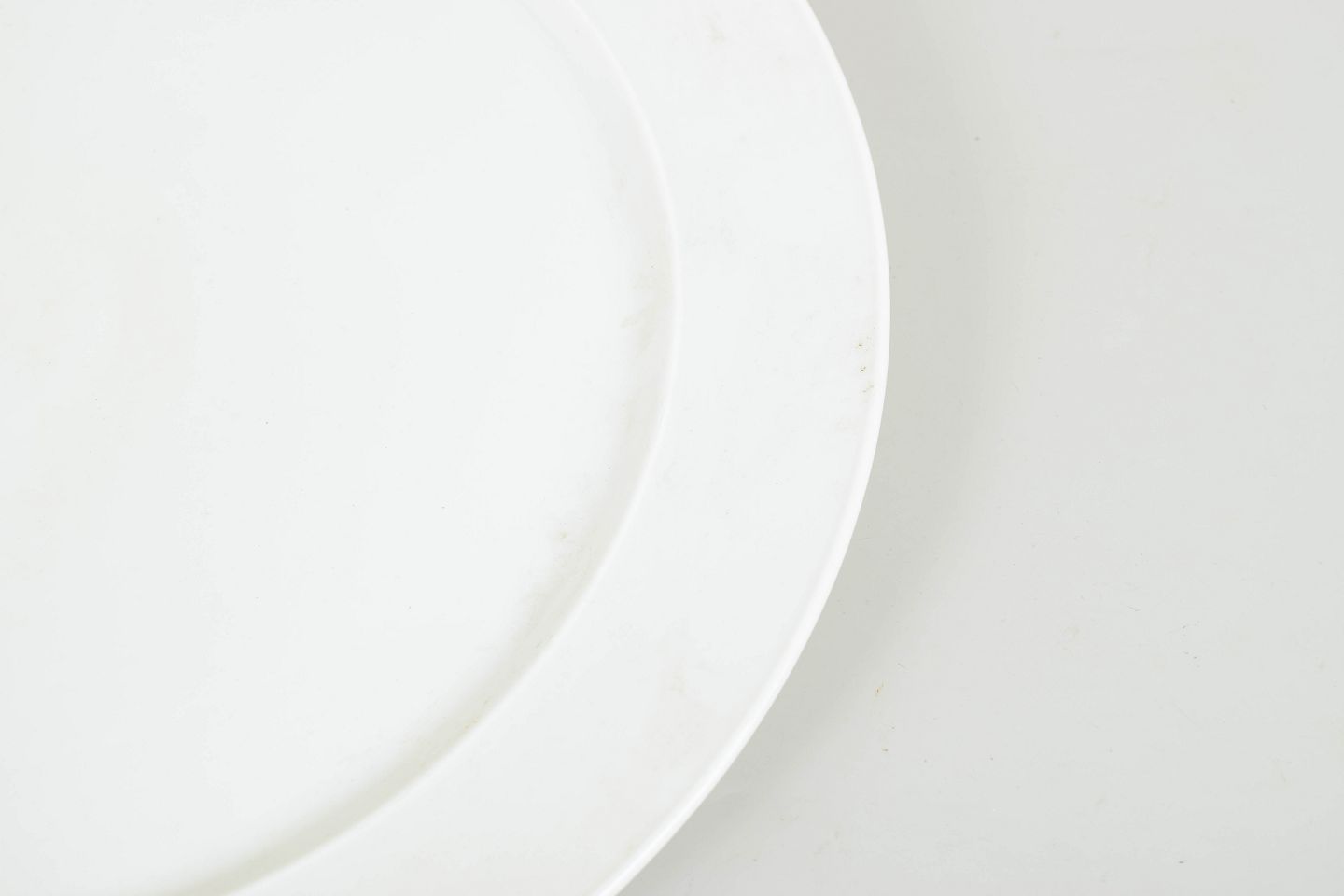 Stort rundt serveringsfad i hvidglaseret porcelæn med bred fane. Produceret i Tyskland og mærket på undersiden med grønt Rosenthal-stempel.