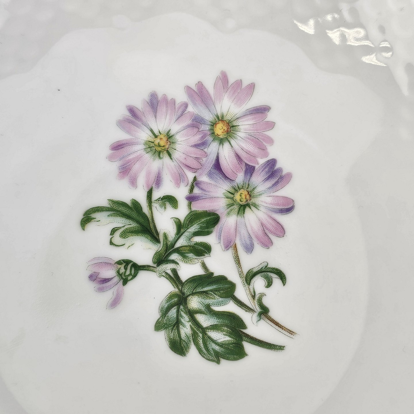 Krysantemum er hvidt porcelæn dekoreret med lys lilla blomst, grønne blade og guldkant.