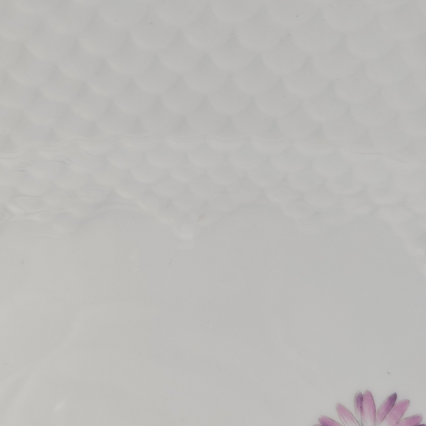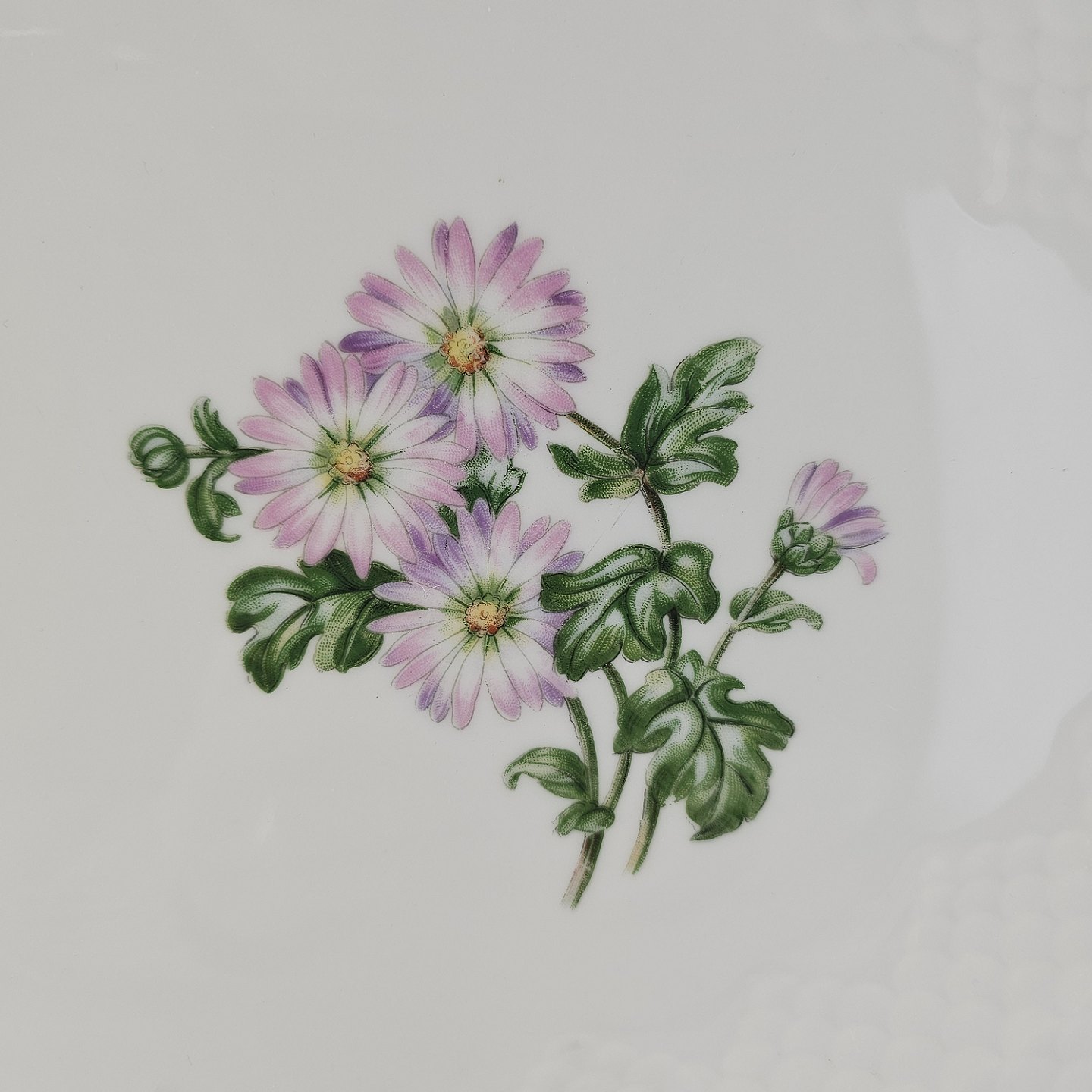 Krysantemum er hvidt porcelæn dekoreret med lys lilla blomst, grønne blade og guldkant.