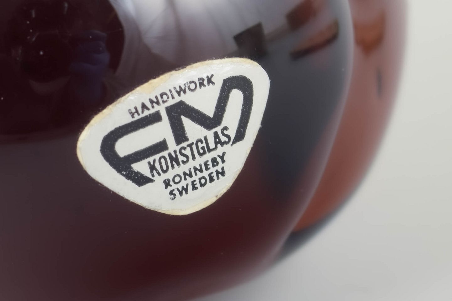 Dekorativ mus i massivt kunstglas med afrundet korpus i dybe rødbrune nuancer og kontrasterende mørkere hoved. Udført med glat, poleret overflade og stiliserede træk. Med originalt mærkat fra FM Konstglas, Ronneby.