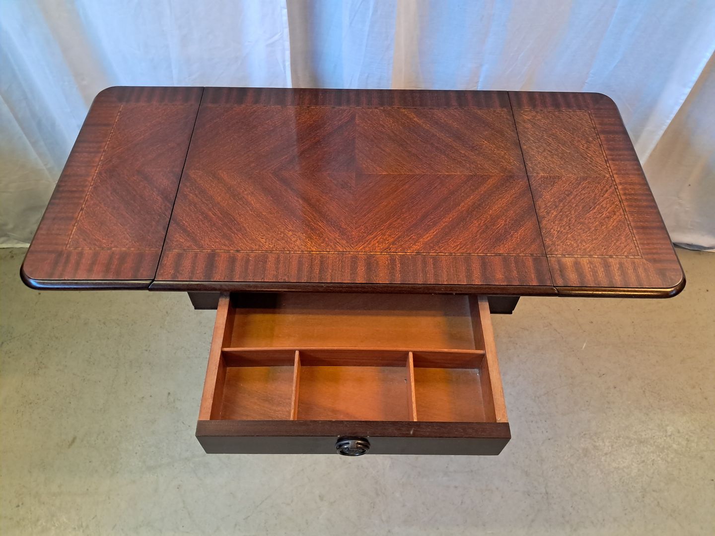 Bord med klapper og skuffe i fineret mahogni, fra 1980erne.