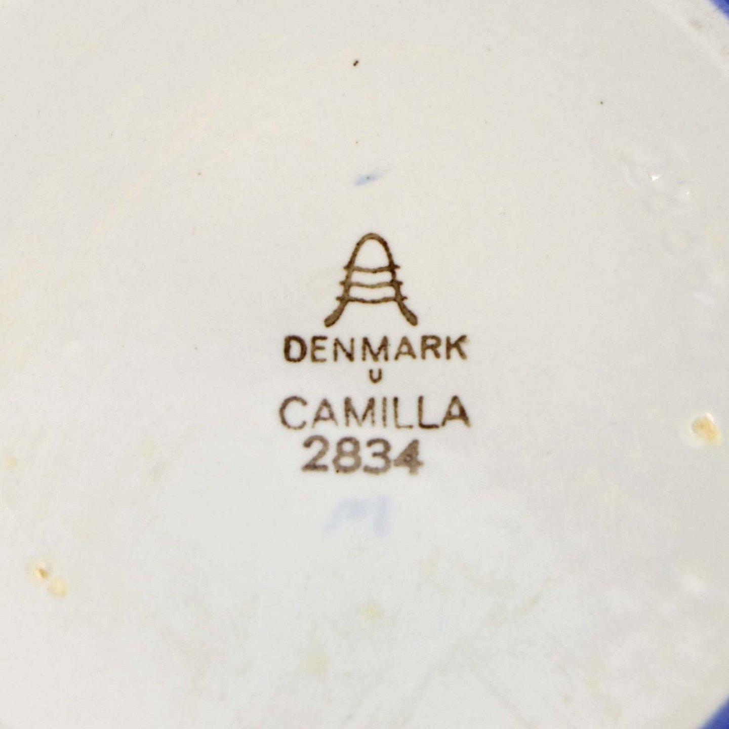 Fajancestel i stelform CA med dekoration af abstrakt motiv i blå og lyseblå på en råhvid baggrund.