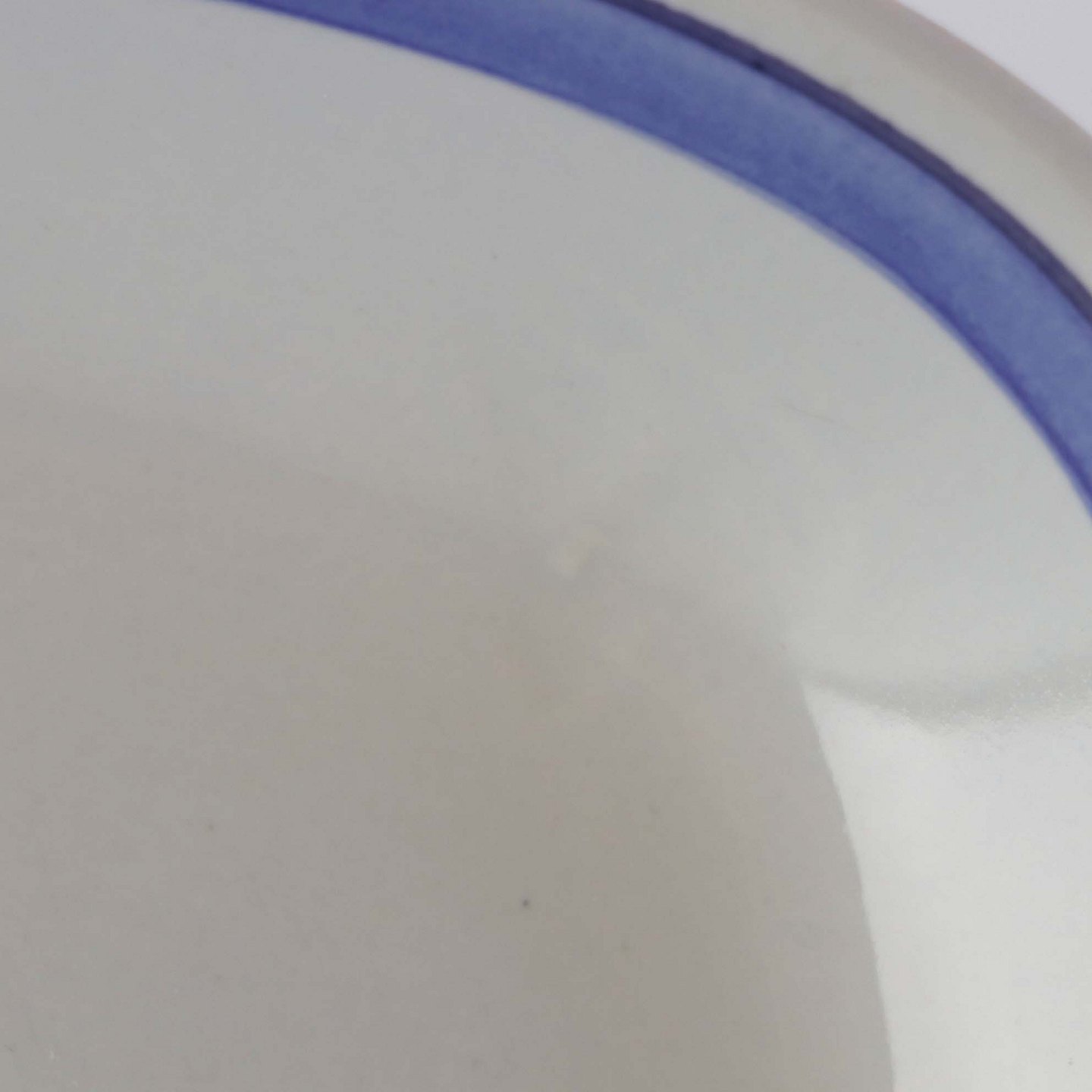 Fajancestel i stelform CA med dekoration af abstrakt motiv i blå og lyseblå på en råhvid baggrund.