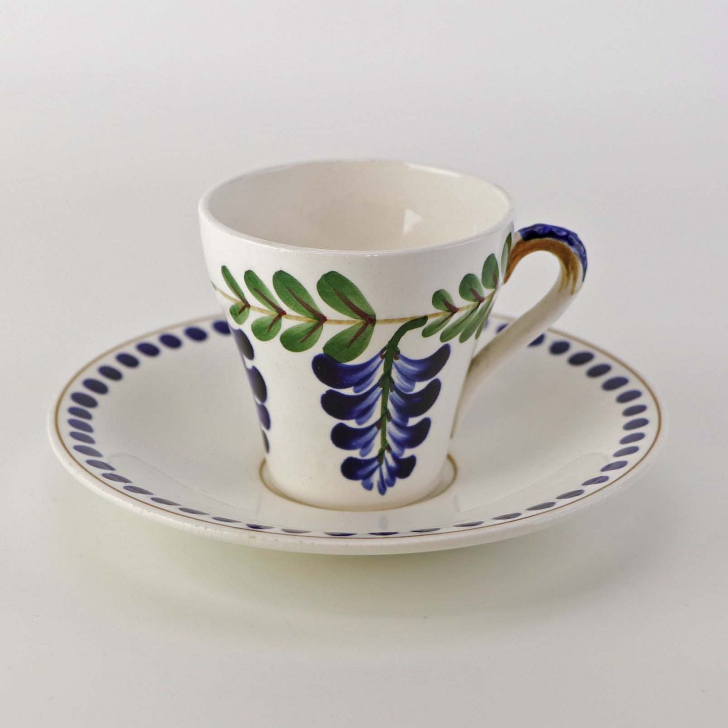 Fajancestel med dekoration af ranker af blåregn og blade på lys baggrund afsluttet med kant af runde blå pletter.