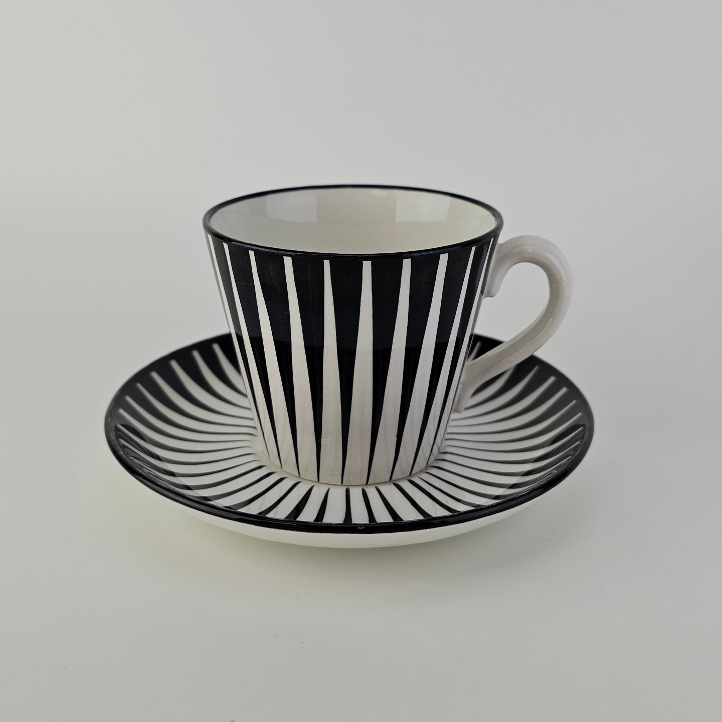 Håndmalet kop med underkop i fajance fra stellet Zebra med mønster i sorte og hvide striber.