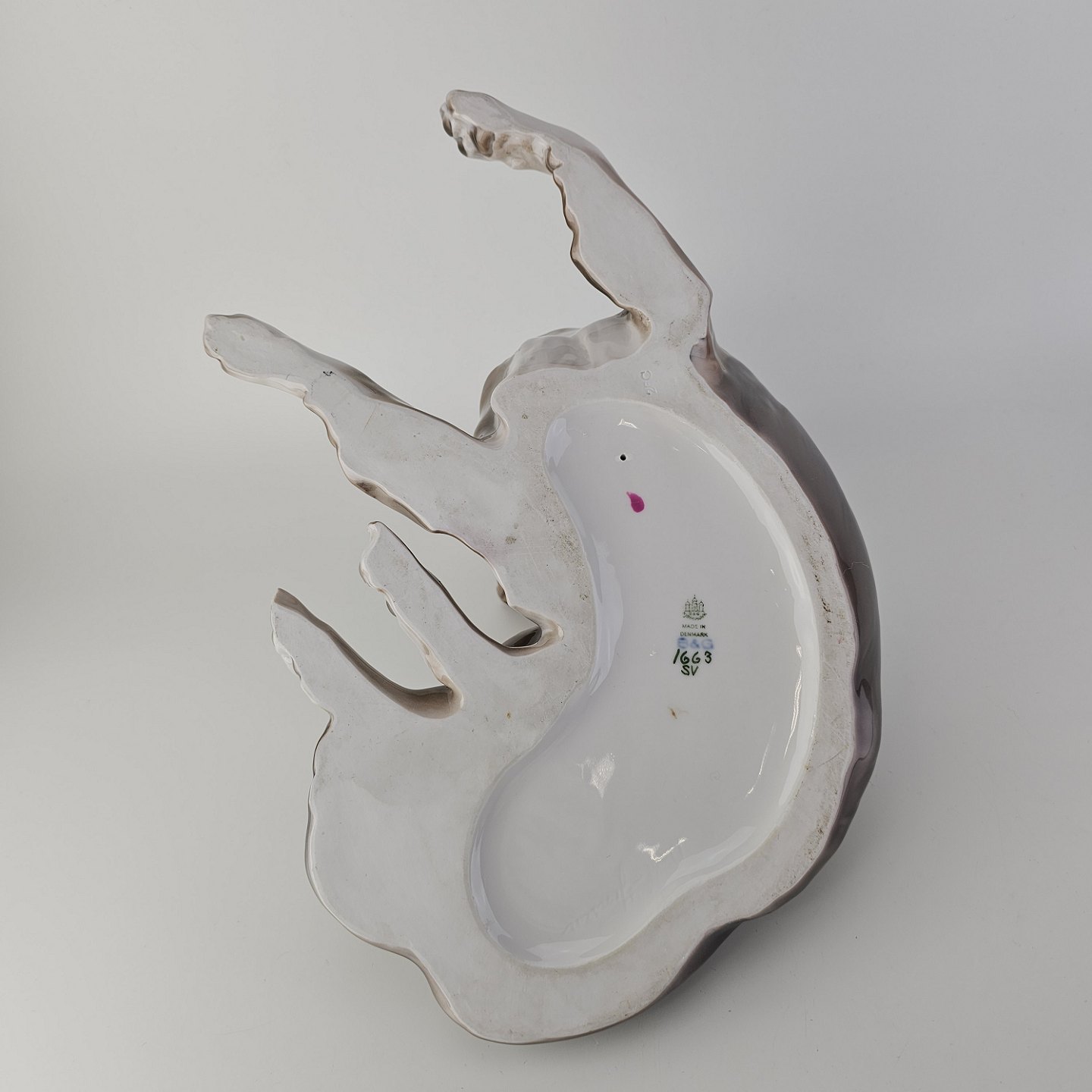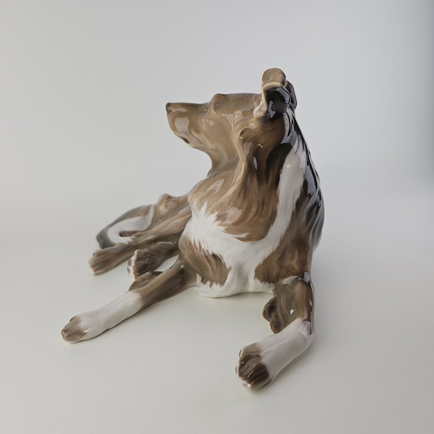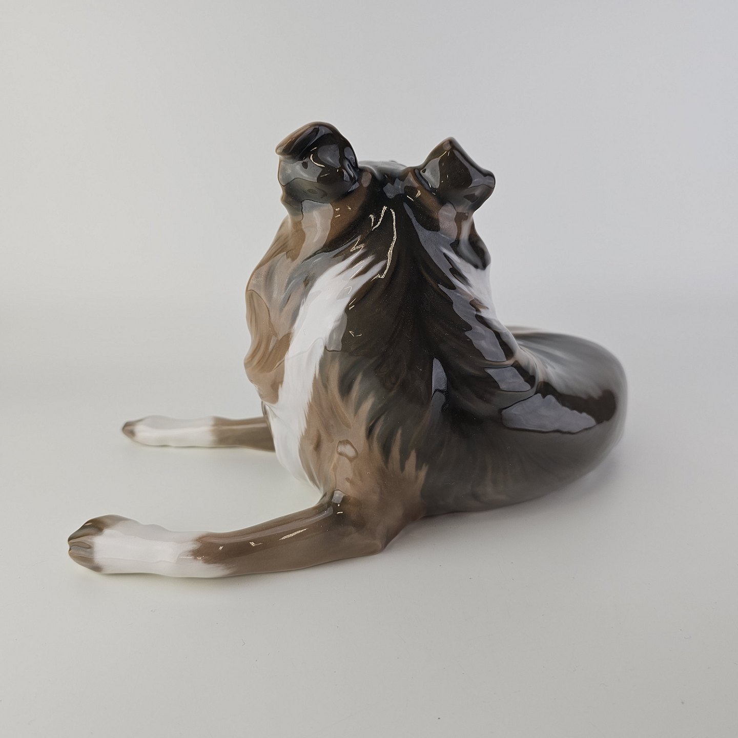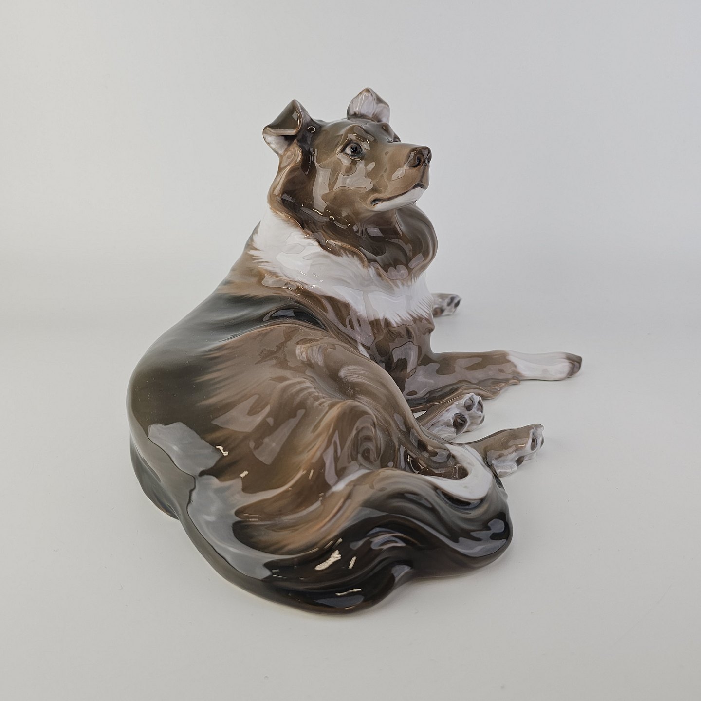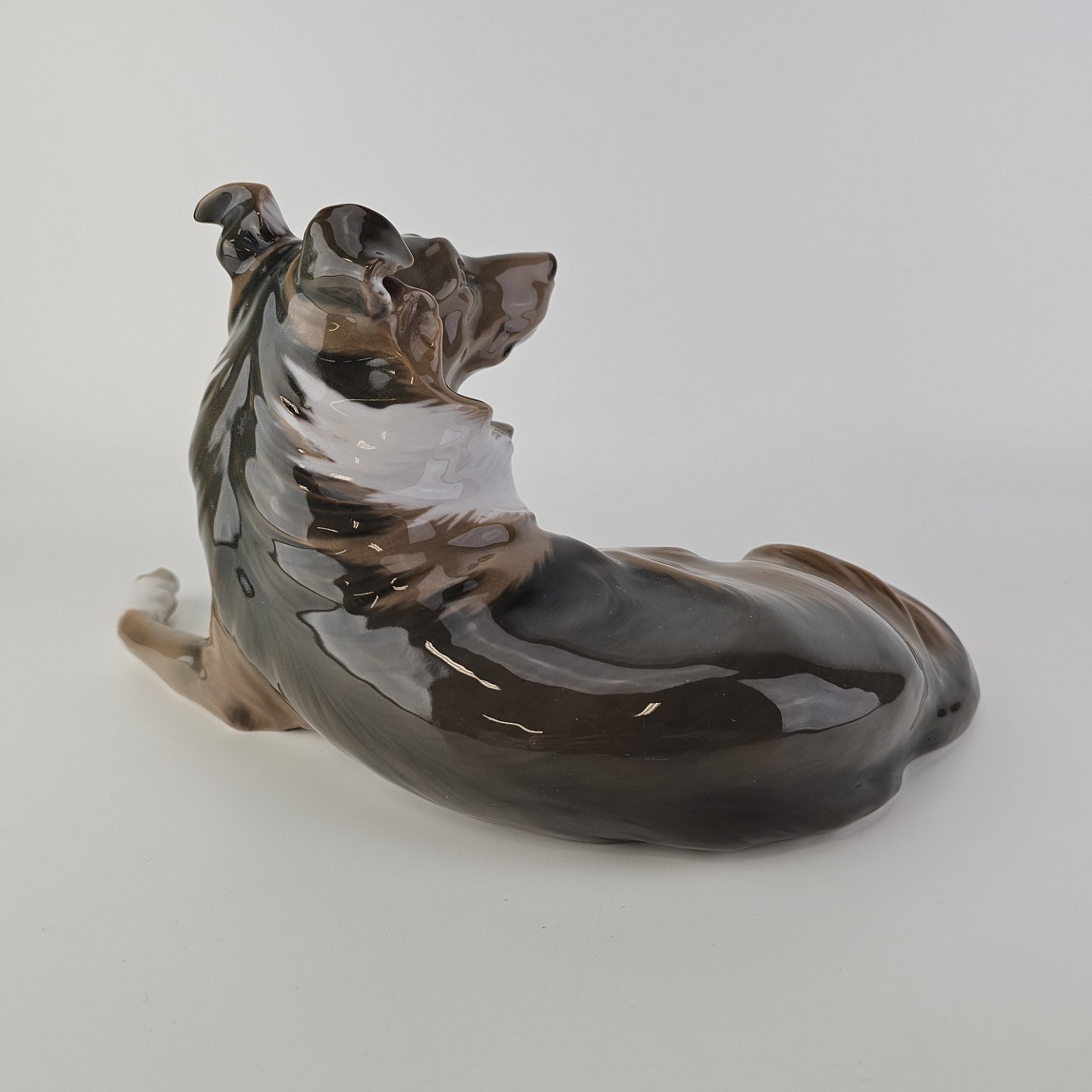 Figur i porcelæn med motiv af en liggende hund.