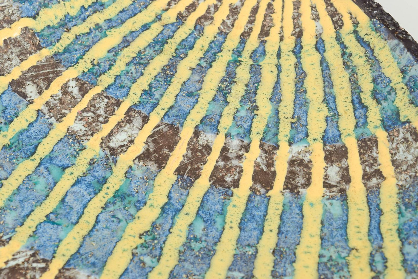 Stort ovalt keramikfad med modelnummer 2350, udført i stentøj med reliefdekoration og flerfarvet glasur i blå og gule nuancer.