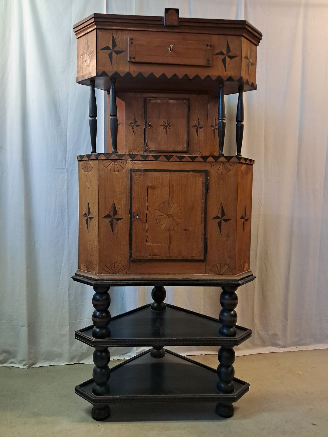 Hjørneskab i ege og elmetræ, det har 200 års jubilæum