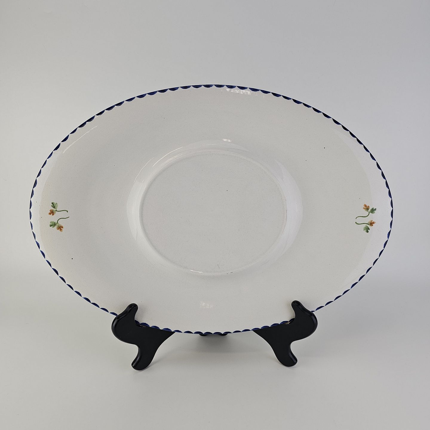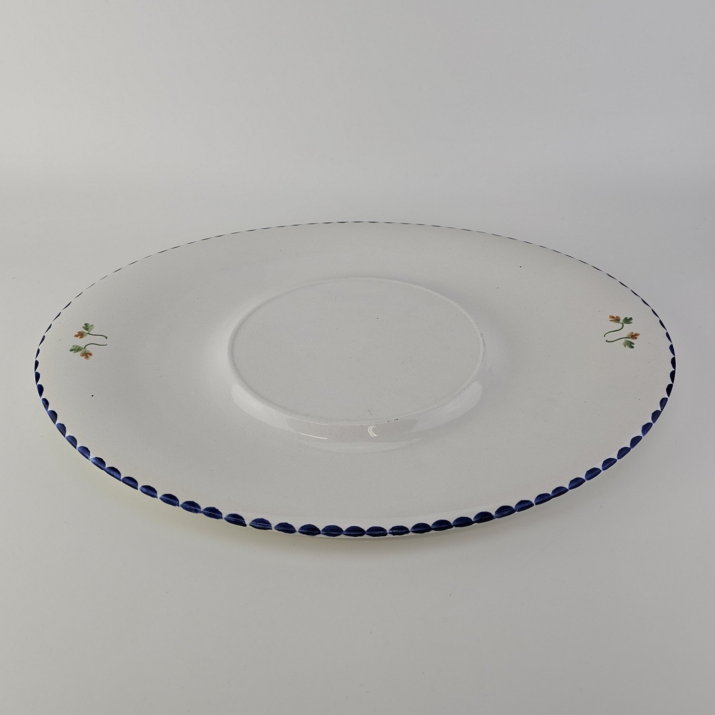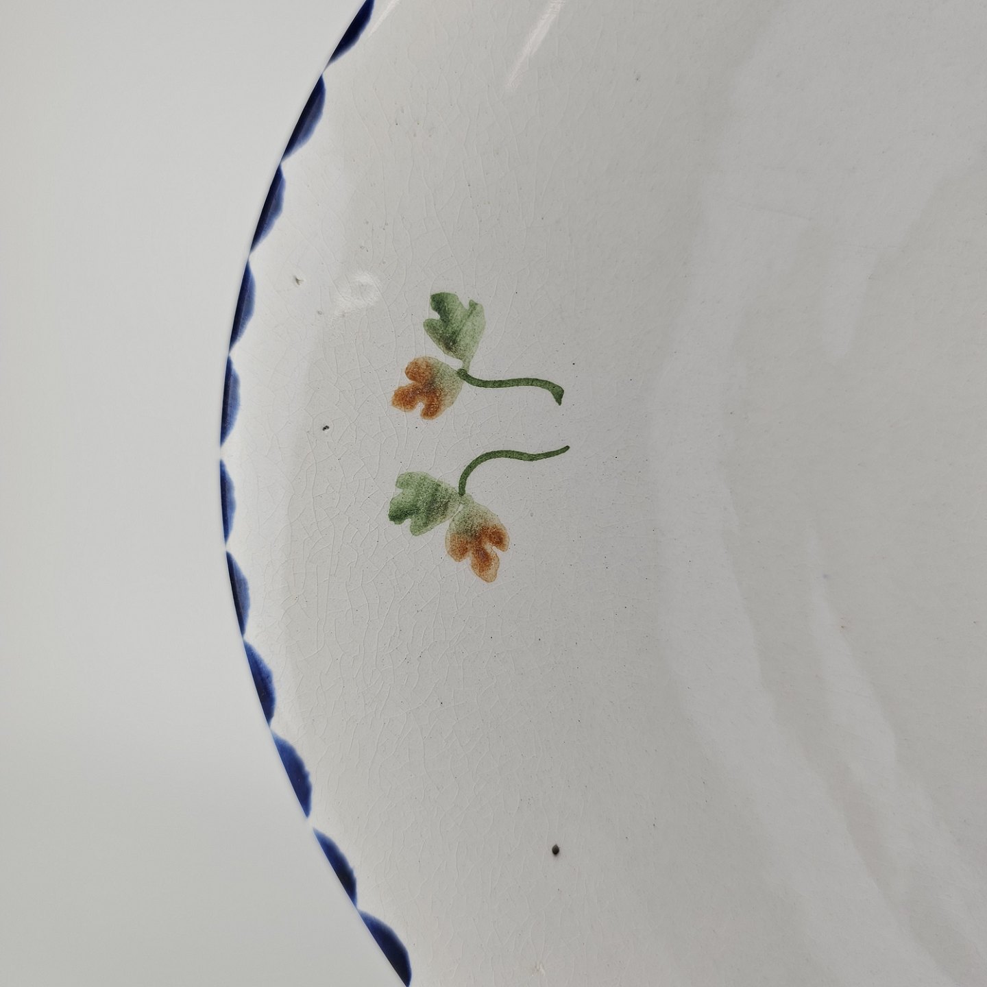 Hvidt fajancestel i stelform Sterling med motiv af blå blomster og blå prikker på kanten.