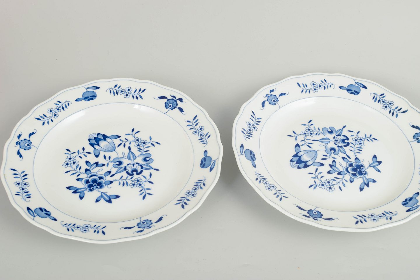 To middagstallerkener i håndmalet porcelæn med Blå Orkidé dekoration. Fremstillet hos Meissen og mærket med Meissen krydssværd. Annulleret med to indridsede streger under bunden.