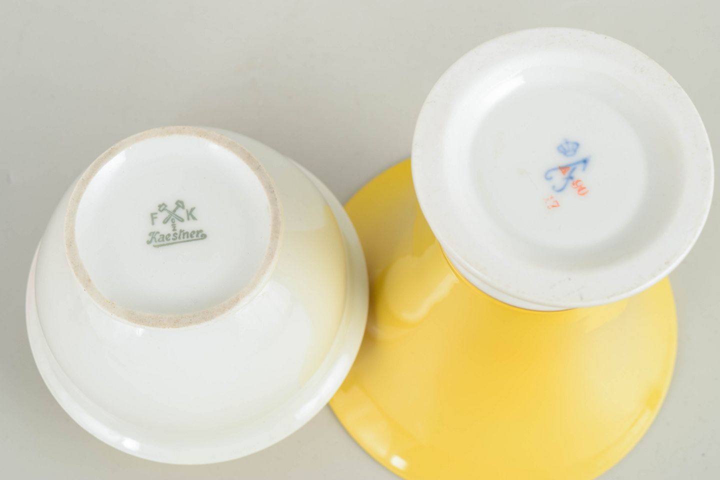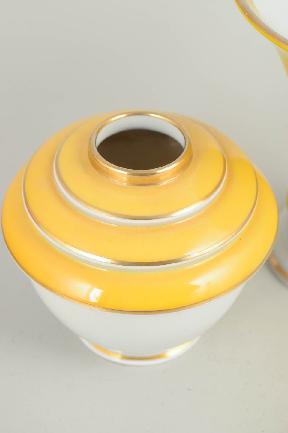To vaser i porcelæn med klassiske art deco former og dekoration i hvide og gule nuancer med stafferinger i guld. Vaserne fremstår med elegante proportioner og karakteristisk stil fra tysk porcelænsproduktion i mellemkrigstiden.