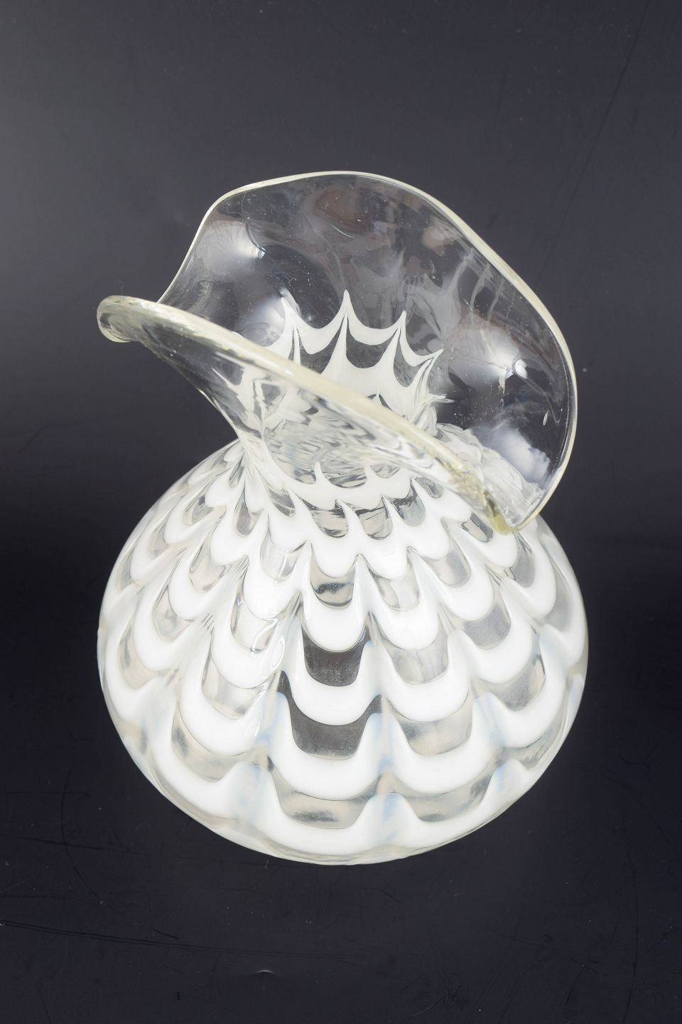 Organisk formet kunstglasvase i klart glas med hvid indlagt dekoration i bølgende, skællignende mønster og kraftigt udadbøjet rand.