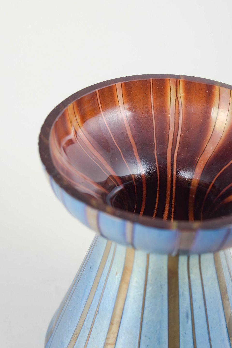 Markant vase i mundblæst glas med kraftig iriserende overflade i blå og kobberfarvede nuancer. Formen er timeglasagtig med bred, tragtformet munding og smallere midterparti. Den lodrette, ribbede struktur og det metalliske farvespil er karakteristisk for Loetz’ produktion i 1920’erne, hvor geometriske og mere stramt artikulerede former afløste den tidligere, mere organiske art nouveau-stil.