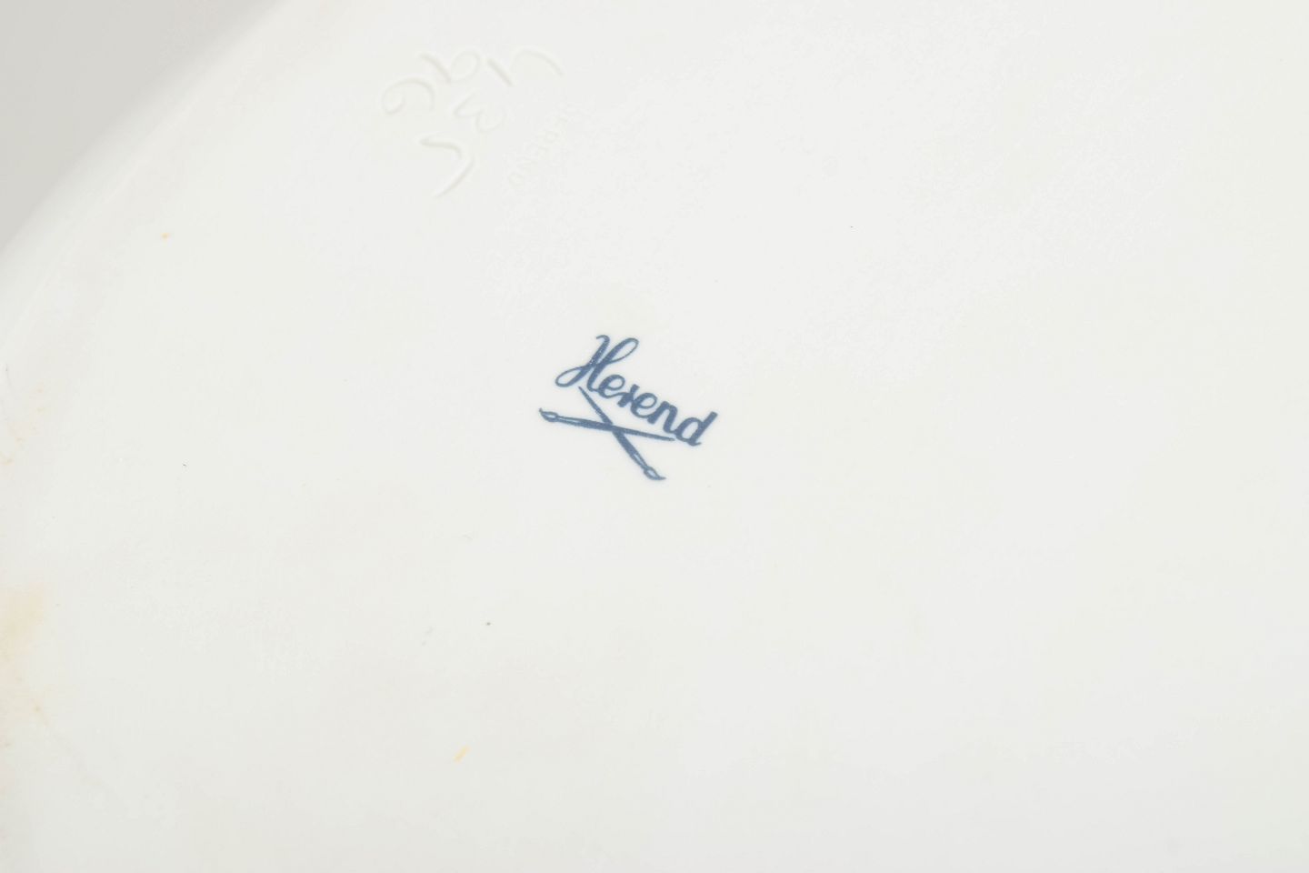Imponerende og elegant ovalt porcelænsfad fra Herend, udført med raffineret håndmalet dekoration og fin forgyldning langs randen. Fadet fremstår med klassisk proportionering og balanceret form, typisk for fabrikkens produktion i mellemkrigstiden. Et repræsentativt og dekorativt serveringsfad fra 1930’erne.
