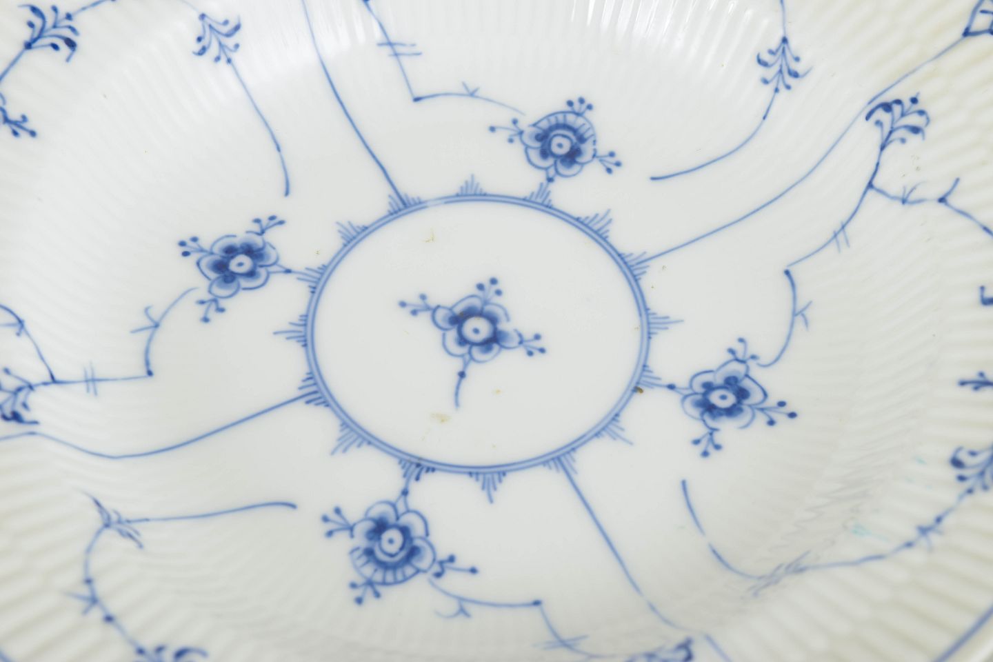 Text zugänglich auf Dänische: Royal Copenhagen Musselmalet Riflet suppetallerkener, sæt af tre.