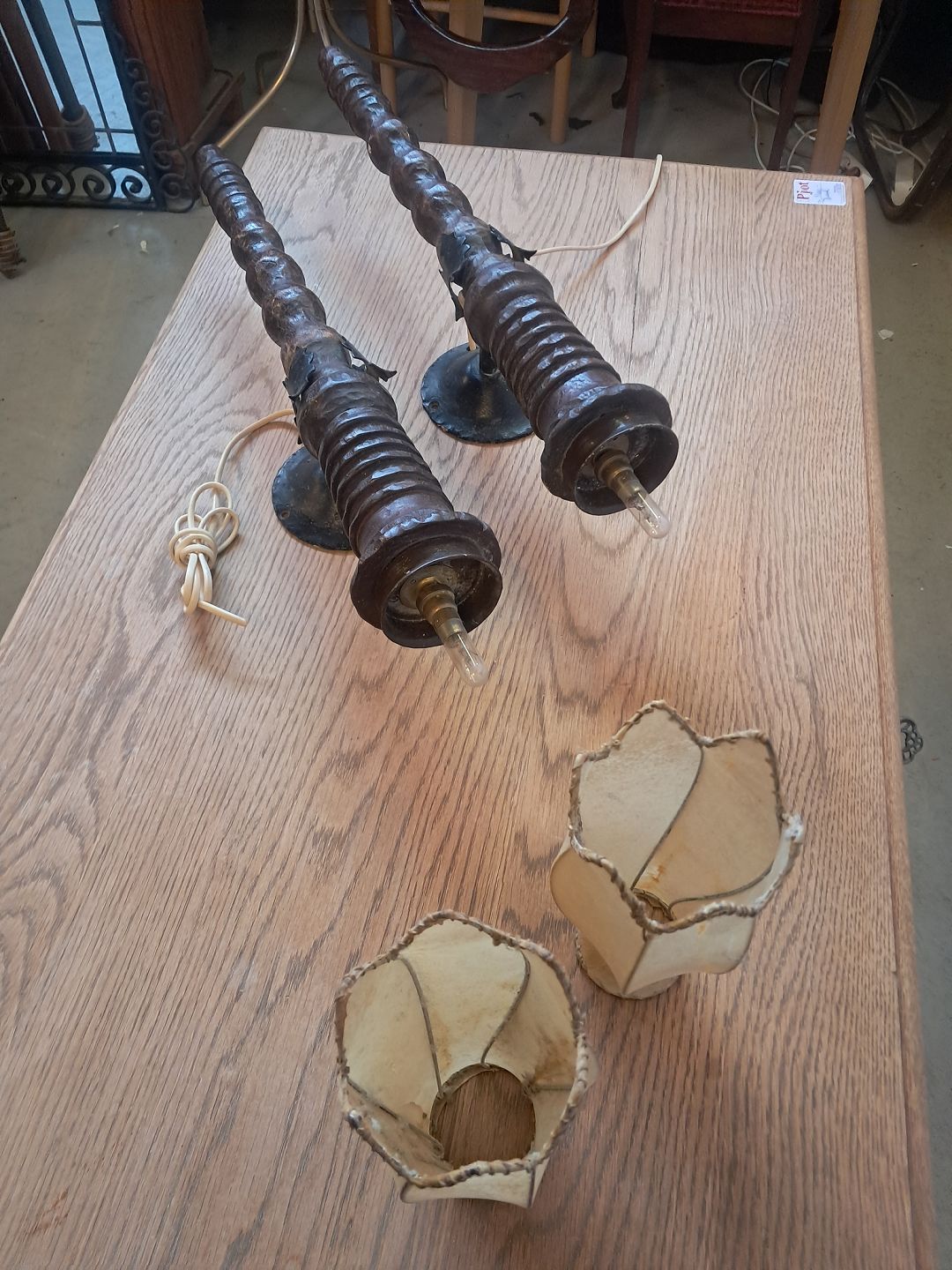 2 Væglamper i massivt egetræ og smedejern, fra 1930erne.
