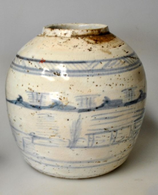 Kinesisk bojan uden låg, 19. årh. Med håndmalet blå dekoration af kystlandskab. Signeret. H.: 16 cm.