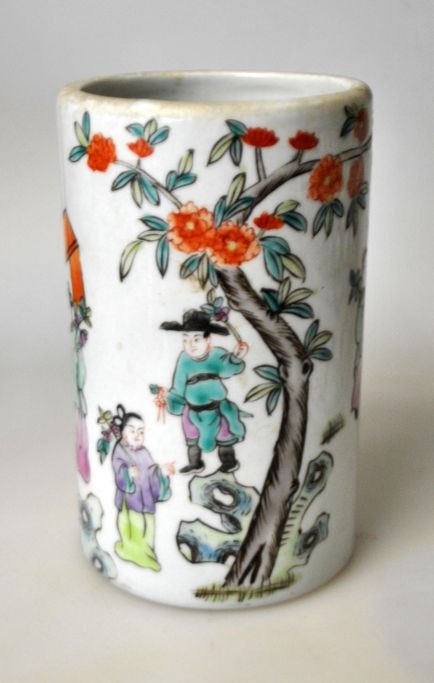 Kinesisk porcelæns penselbæger, 19./20. årh. Med håndmalet dekoration med en masse mennesker. Stemplet. H.: 13 cm.