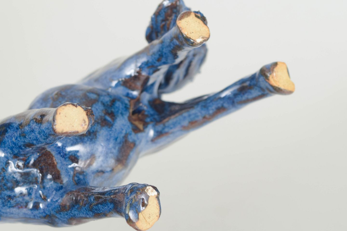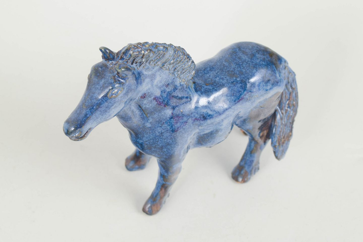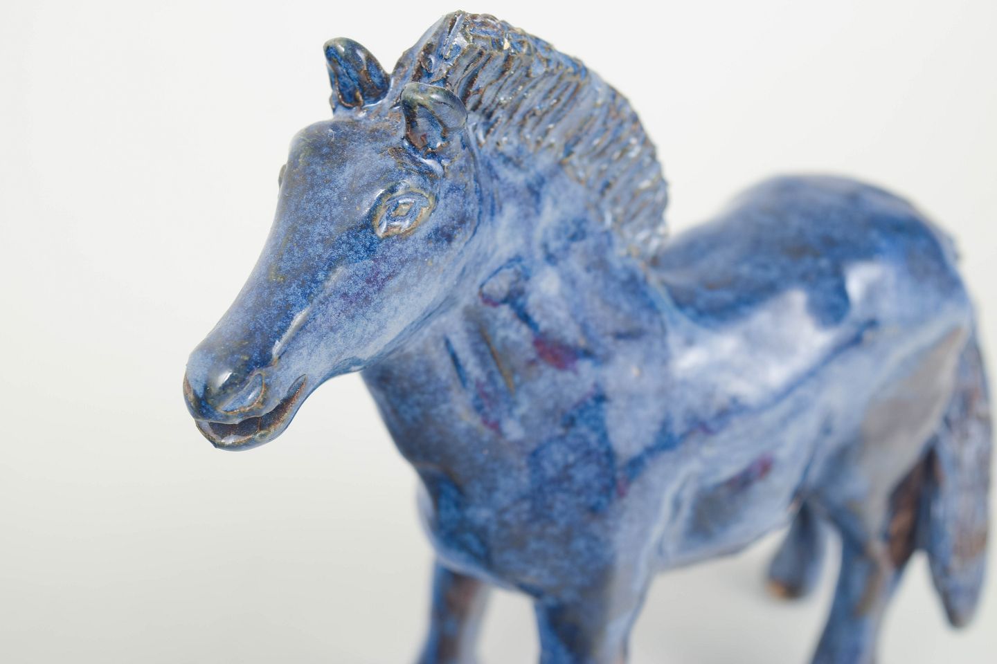 Unik keramisk figur forestillende et føl udført i stentøj med blank glasur i blå toner med brunlige nuancer. Figuren er modelleret med en naturlig kropsholdning og detaljeret manke og hoved, hvilket giver et levende og karakterfuldt udtryk. Usigneret unika fra 1970’erne.