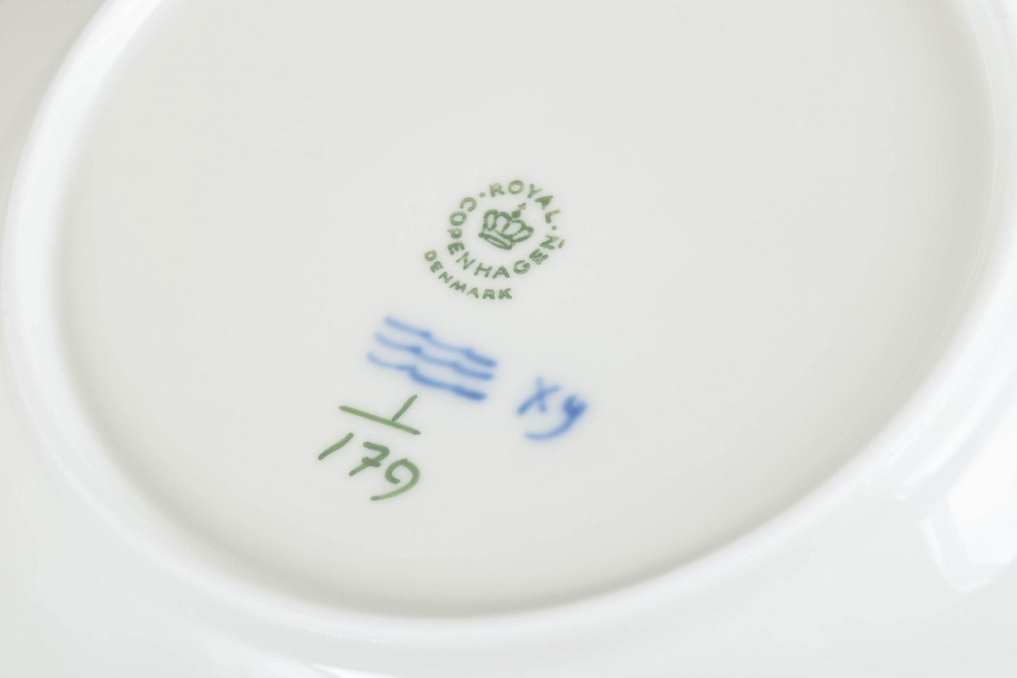 Set of three hand-painted porcelain plates decorated with the classic blue fluted pattern in cobalt underglaze. The plates feature a fluted rim and a central floral motif surrounded by stylised floral garlands, characteristic of the series. Marked underneath with the Royal Copenhagen factory mark and first factory quality. Model 1/179.