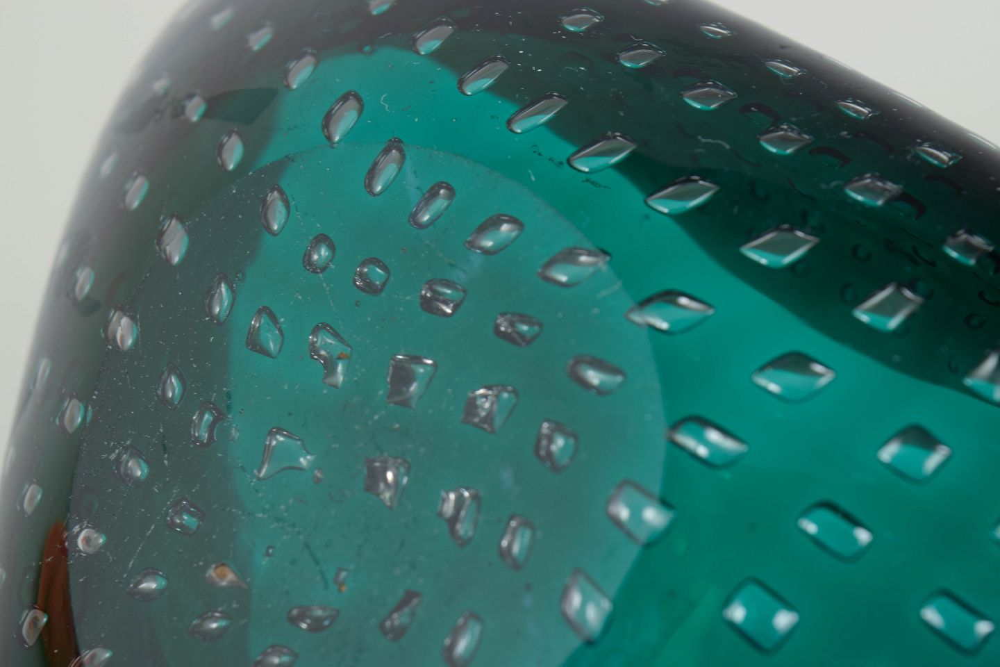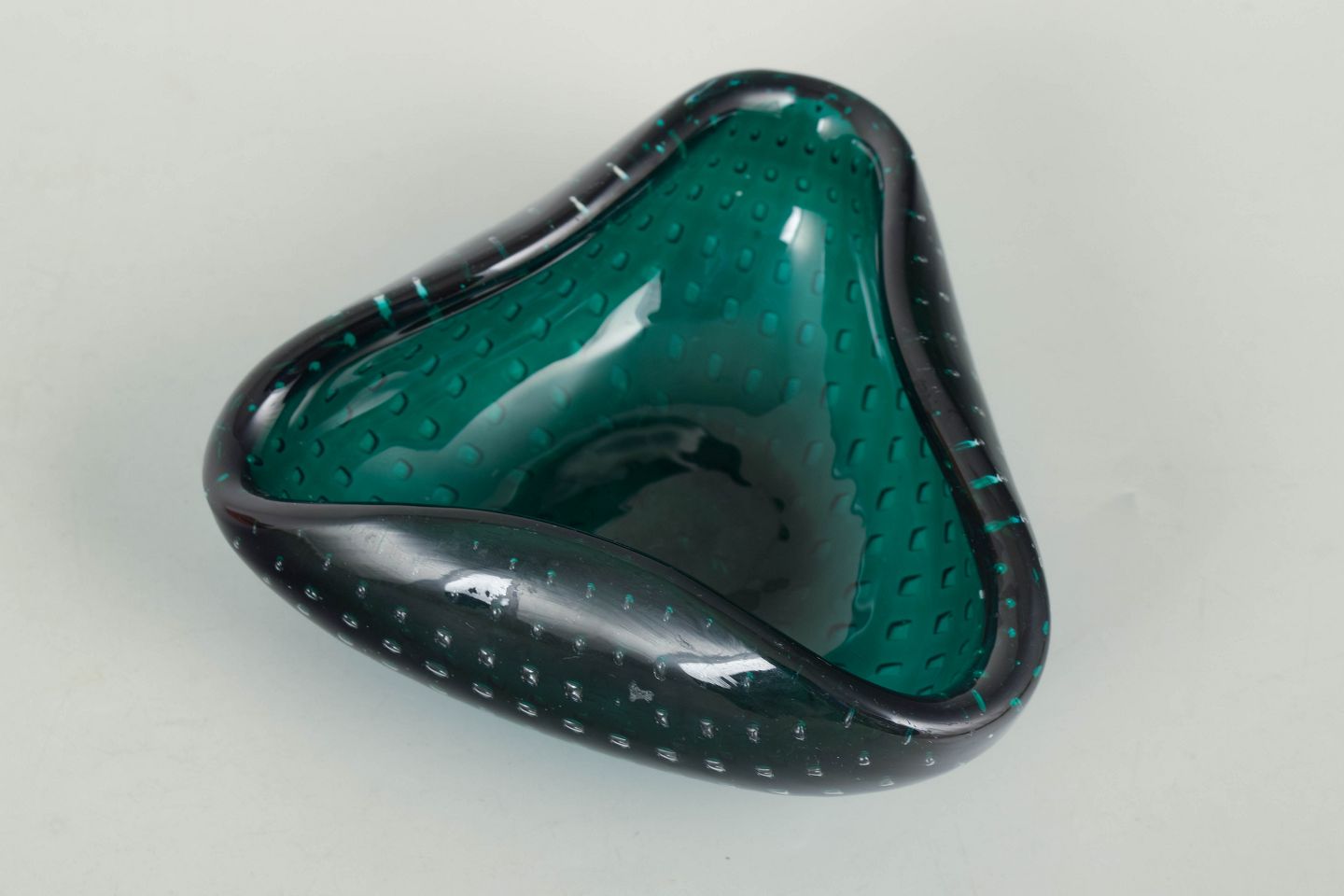 Organisk formet kunstglasskål i grønt glas med indkapslede luftbobler og blødt bølgende rand, udført i den karakteristiske Murano-stil fra midten af det 20. århundrede.