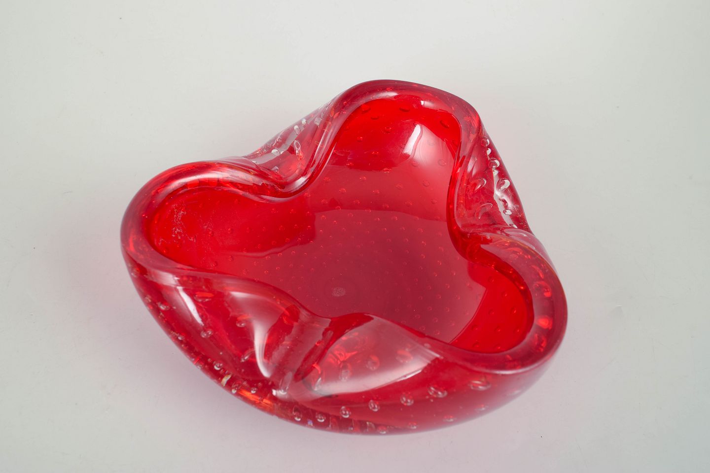 Organisk formet glasskål i kraftigt rødt glas med indkapslede luftbobler og blødt bølgende rand, udført i den karakteristiske italienske kunstglasstil fra Murano.