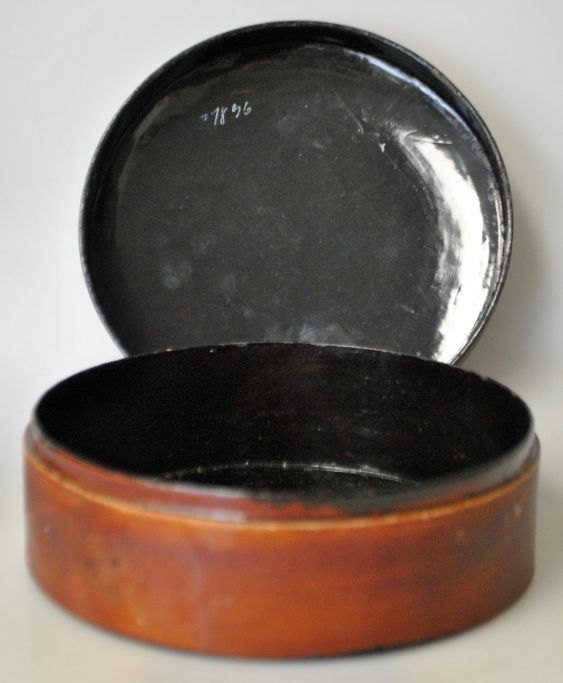Kinesisk trææske med guldbemaling, 19. årh. Dekoreret med fugle og landskab. H: 7 cm. Dia: 17 cm.