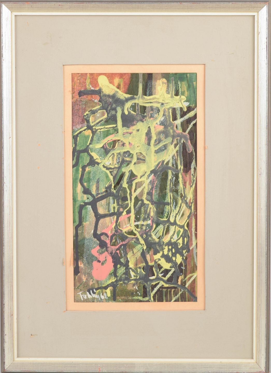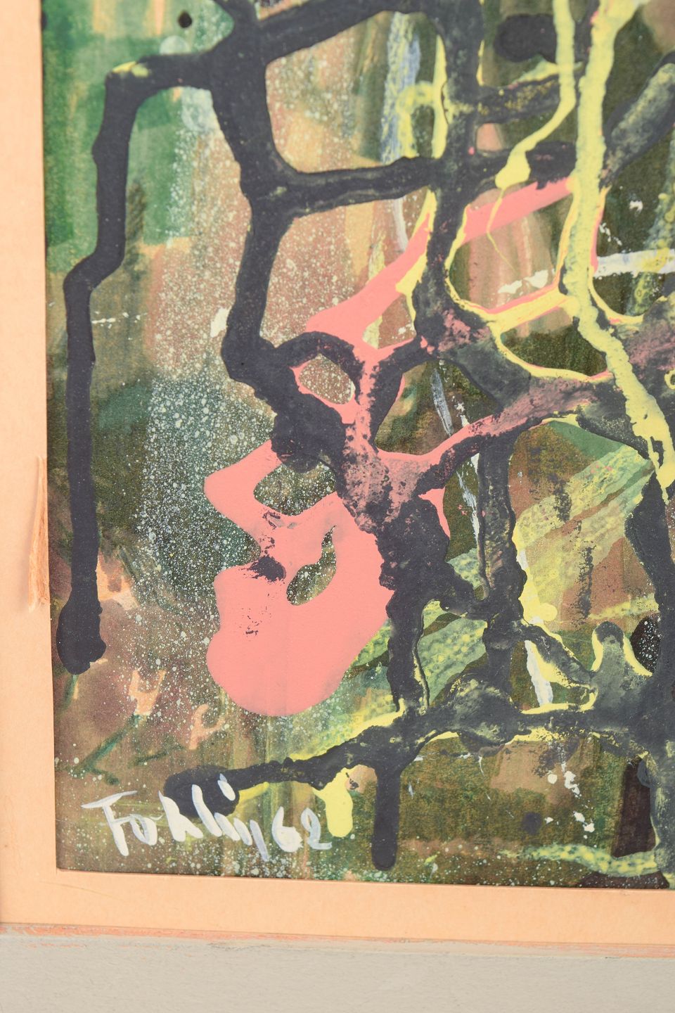 Abstrakt komposition udført i mixed media på papir med kraftige lag af farve, dryppede linjer og ekspressive penselstrøg i grønne, gule, sorte og rosa toner. Kompositionen har et spontant og gestisk udtryk med overlappende former og strukturer.