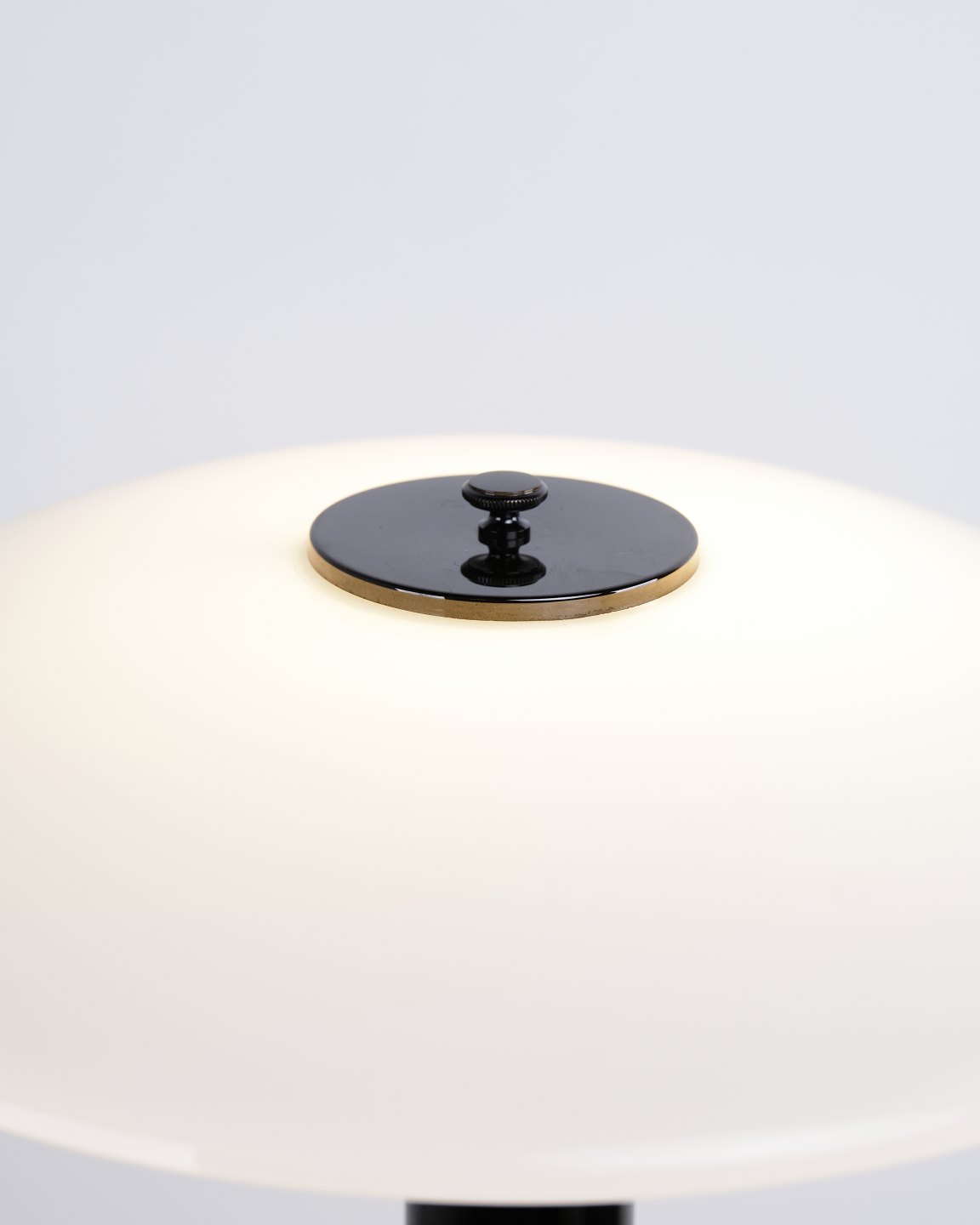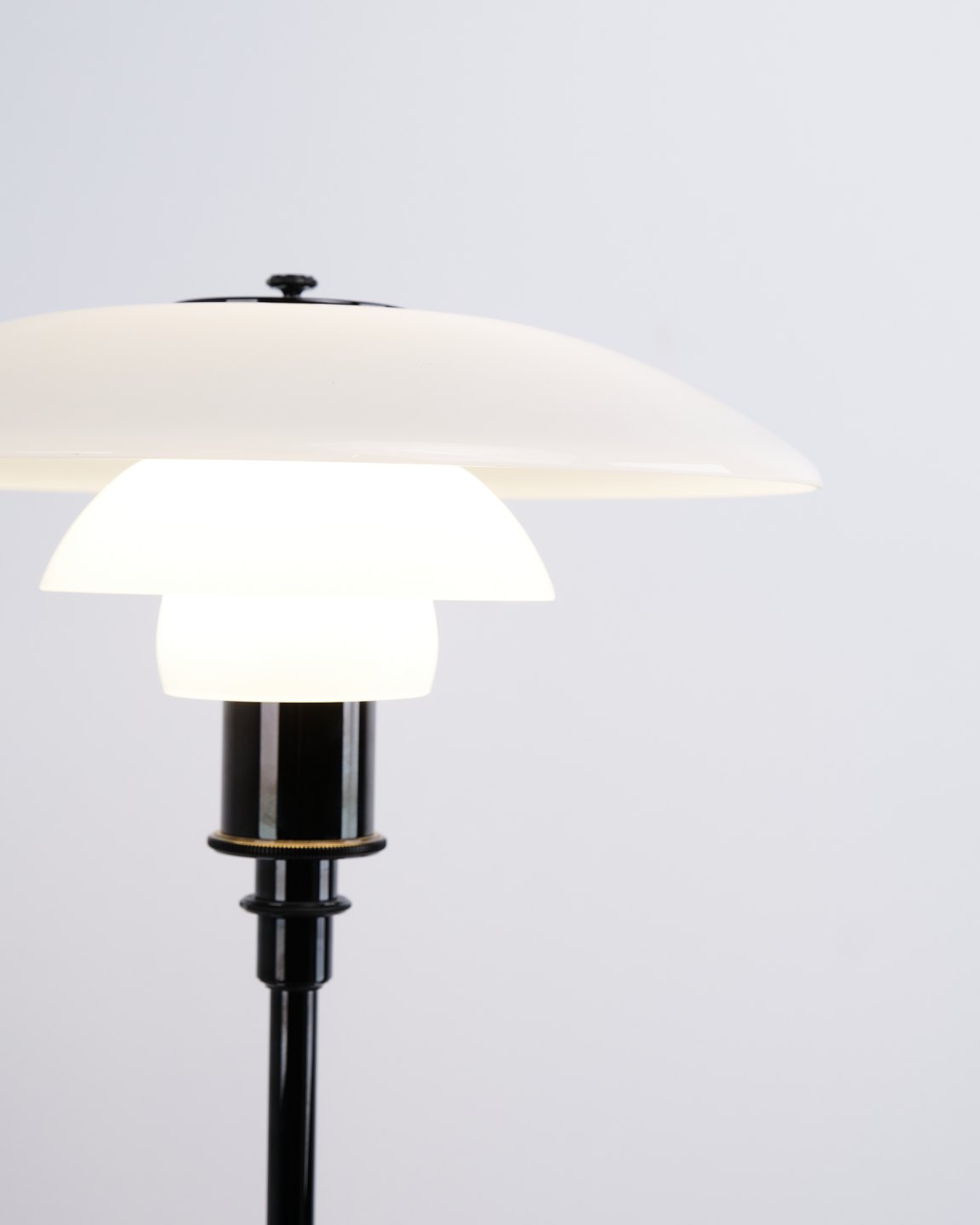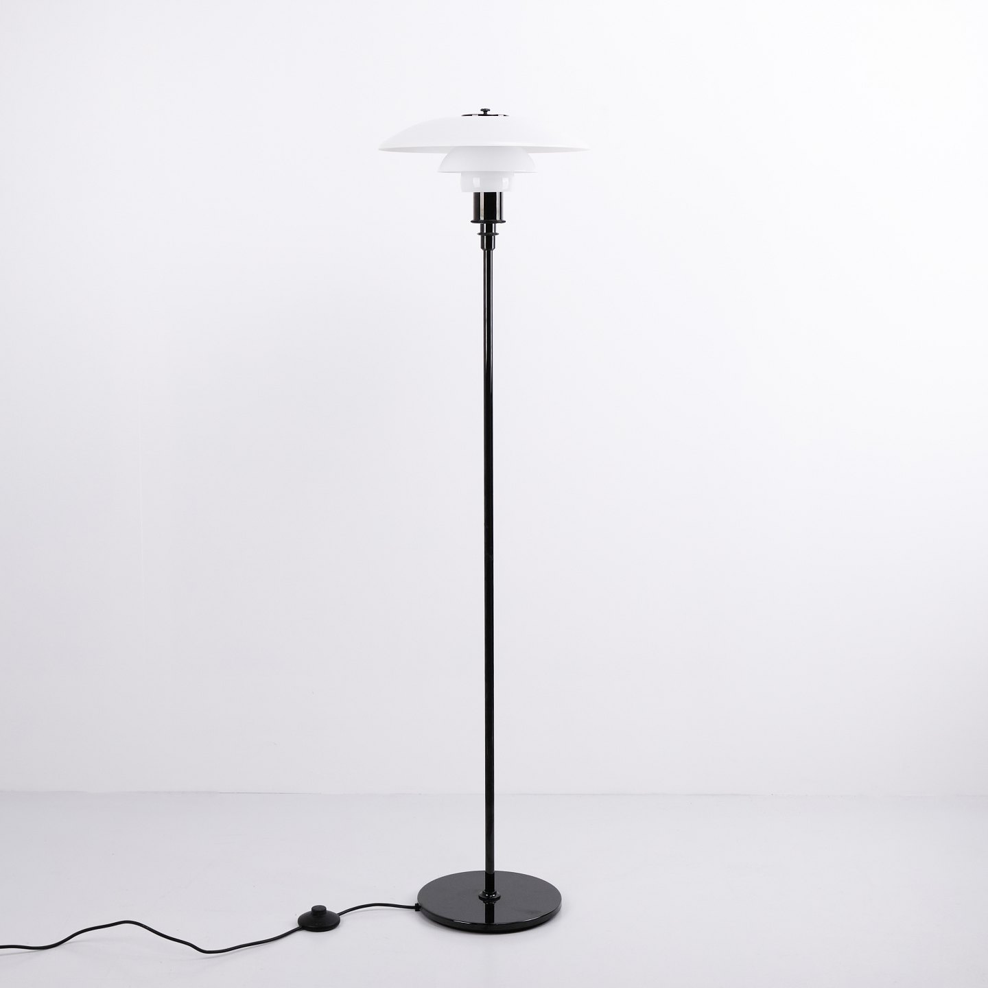 PH 3.5/2.5 floor lamp designed by Poul Henningsen and produced by Louis Poulsen. The lamp is made with a black frame and shades in white opal glass, giving an elegant and balanced expression. The iconic three-shade system ensures a soft, glare-free light and an even light distribution.