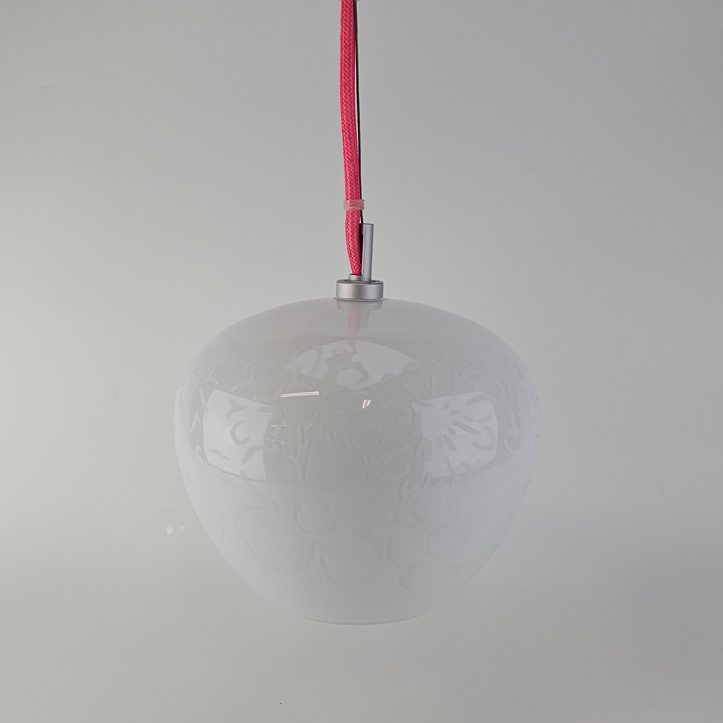 Pendel i hvidt mundblæst glas med blomstermotiver og monteret med lyserød ledning