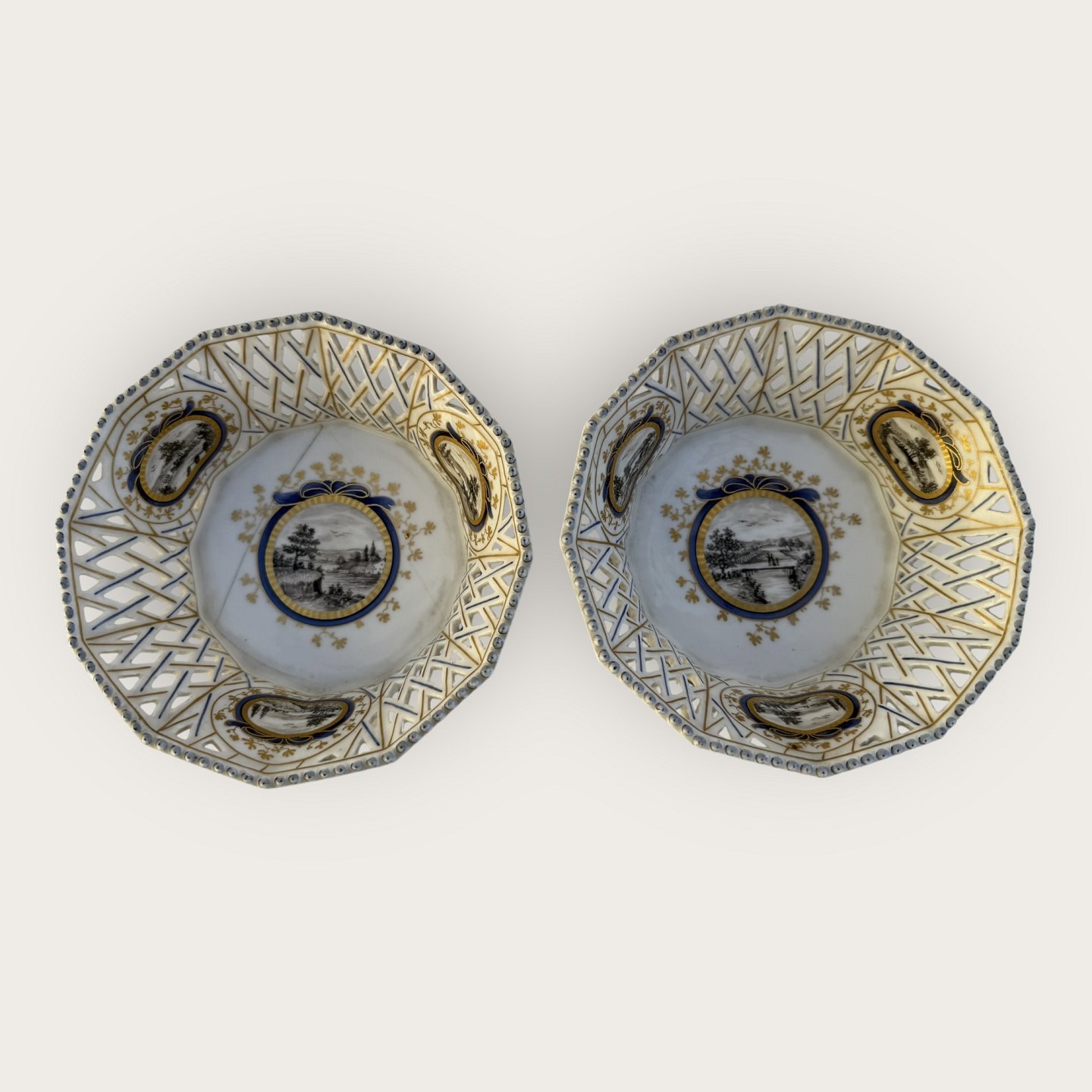Nymphenburg porcelæn, to retikulerede skåle (gennembrudt gittermønster i kanten), med håndmalede landskabsmotiver, den ene skål med revne i bunden ( se foto) ellers fin stand, Hver skål måler ca. 5x14cm.