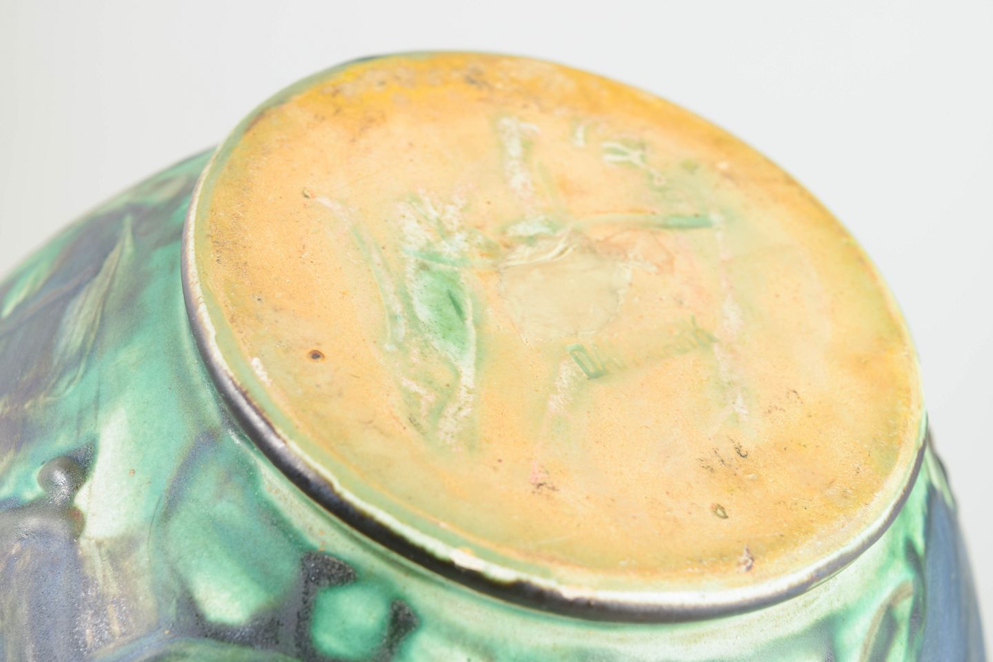 Large vase in glazed earthenware with a baluster form and narrow neck. Executed in the characteristic cowhorn glaze with deep green, blue and dark tones, where the glaze flows in organic patterns creating a dramatic and vivid surface. Signed HAK to the base.