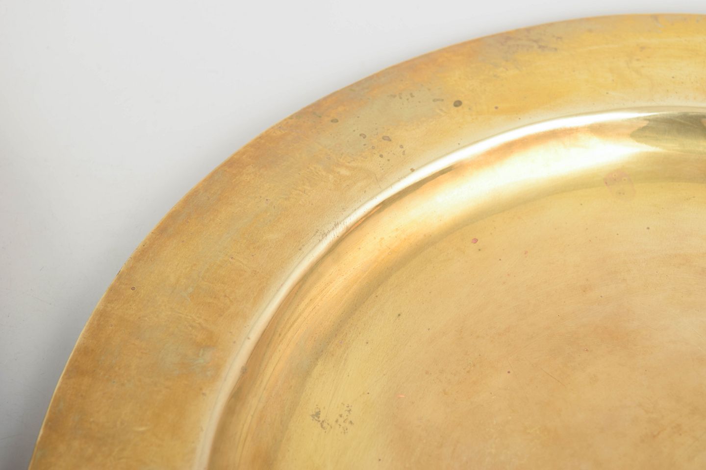 Large round charger plates in polished brass with a wide rim. Classic and elegant table setting pieces from the 1960s with a warm golden surface.