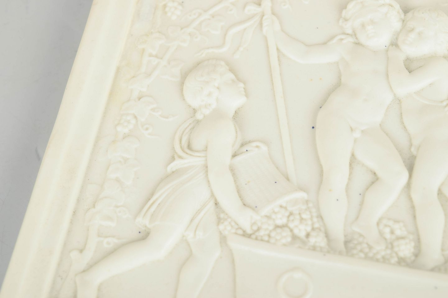 Rektangulært vægrelief i hvidt bisquitporcelæn med klassicistisk motiv af putti og figurkomposition efter Bertel Thorvaldsen, udført med fine detaljer og blød modellering i nyklassicistisk stil.