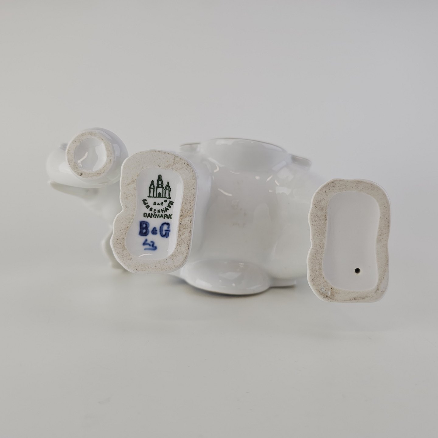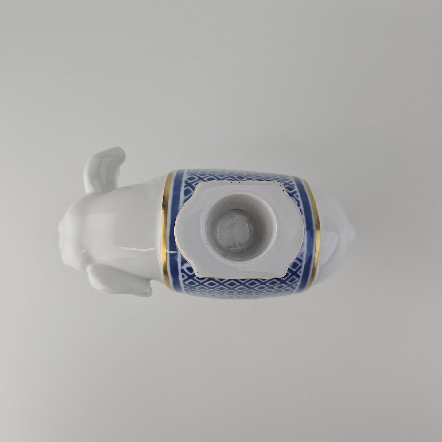 Figur i hvidt porcelæn med motiv af en elefant med teksten 2. marts 1908-1933 på den ene side. Lavet specielt til Carlsberg, brugt som gave derfra.