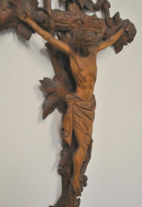 Udskåret træ krusifix, 19. årh. Tyskland. Kors dekoreret med vinranke, vindruer og løb. H: 48 cm. B.: 22 cm.