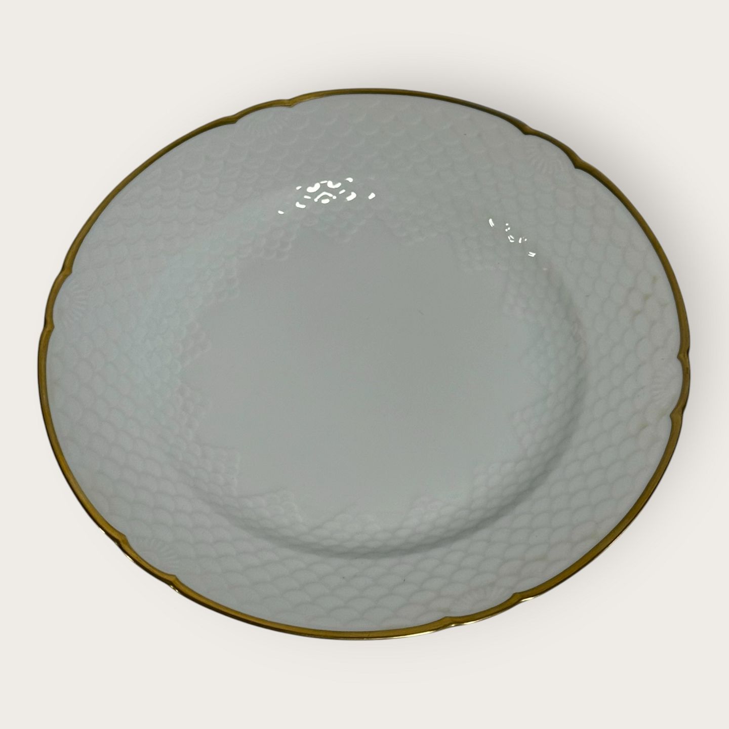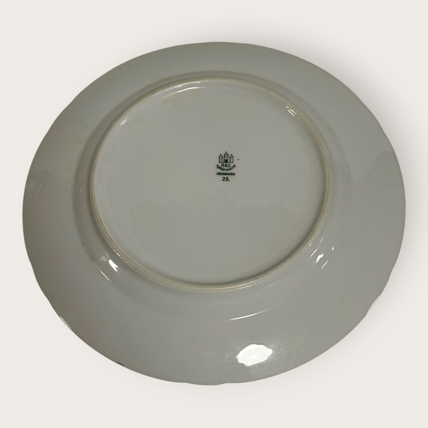 | Bing & Grøndahl, Aakjær, Hvid porcelæn med guldkant, Middags tallerken # 25, 24,5cm i diameter, 1.sortering *Pæn stand*
