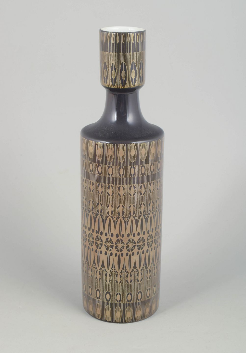 Slank porcelænsvase med høj hals og rig gulddekoration i geometrisk mønster på mørk baggrund, typisk for Rosenthals dekorative produktion i slutningen af det 20. århundrede.