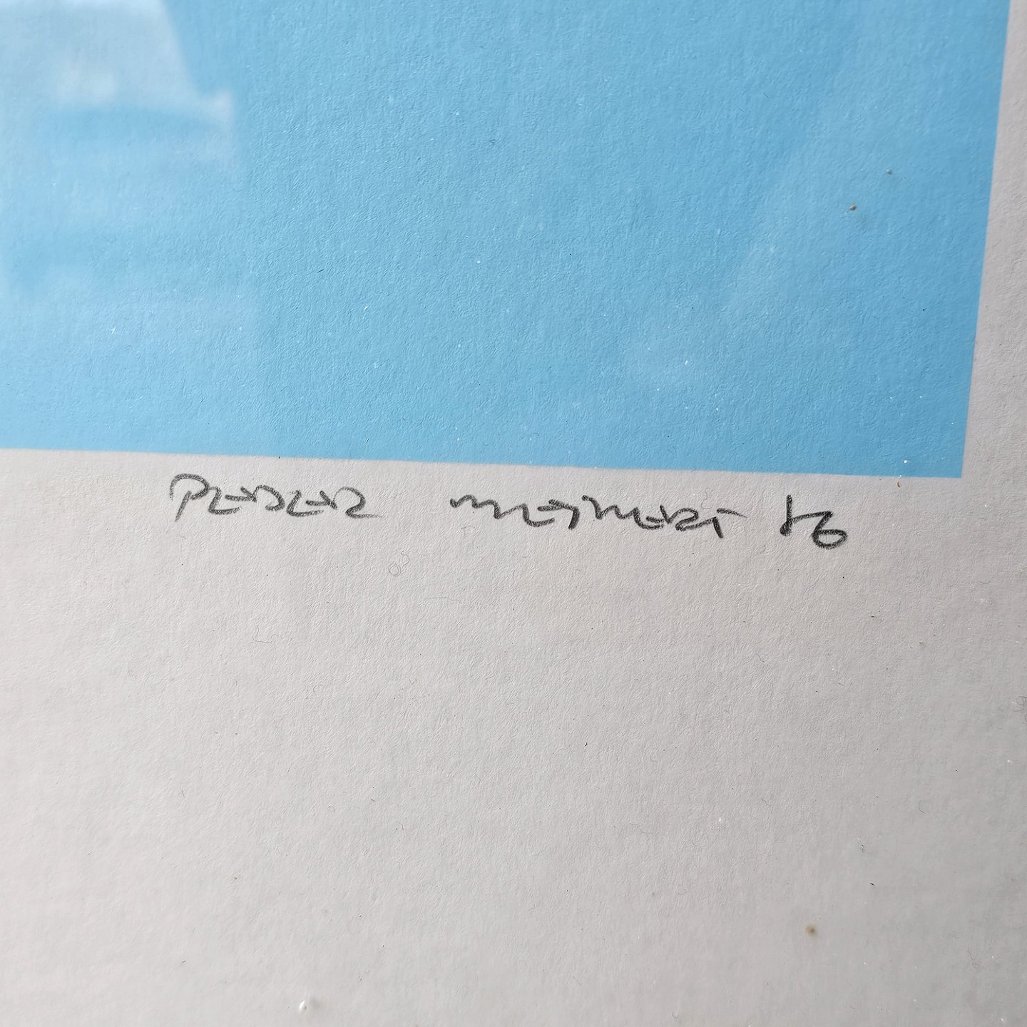 Litografi med blå, hvide og gule farver på lyseblå baggrund i metal ramme. 13/92