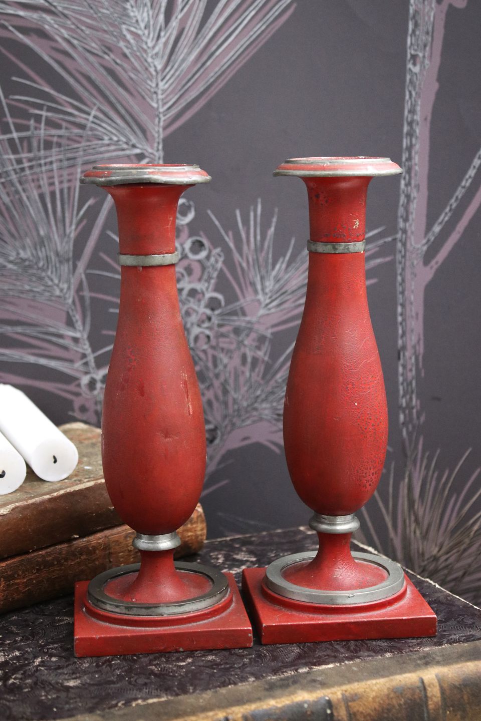 Et par Augustenborg tinstager fra omkring år 1840 med rød original bemaling. Højde: 21cm.