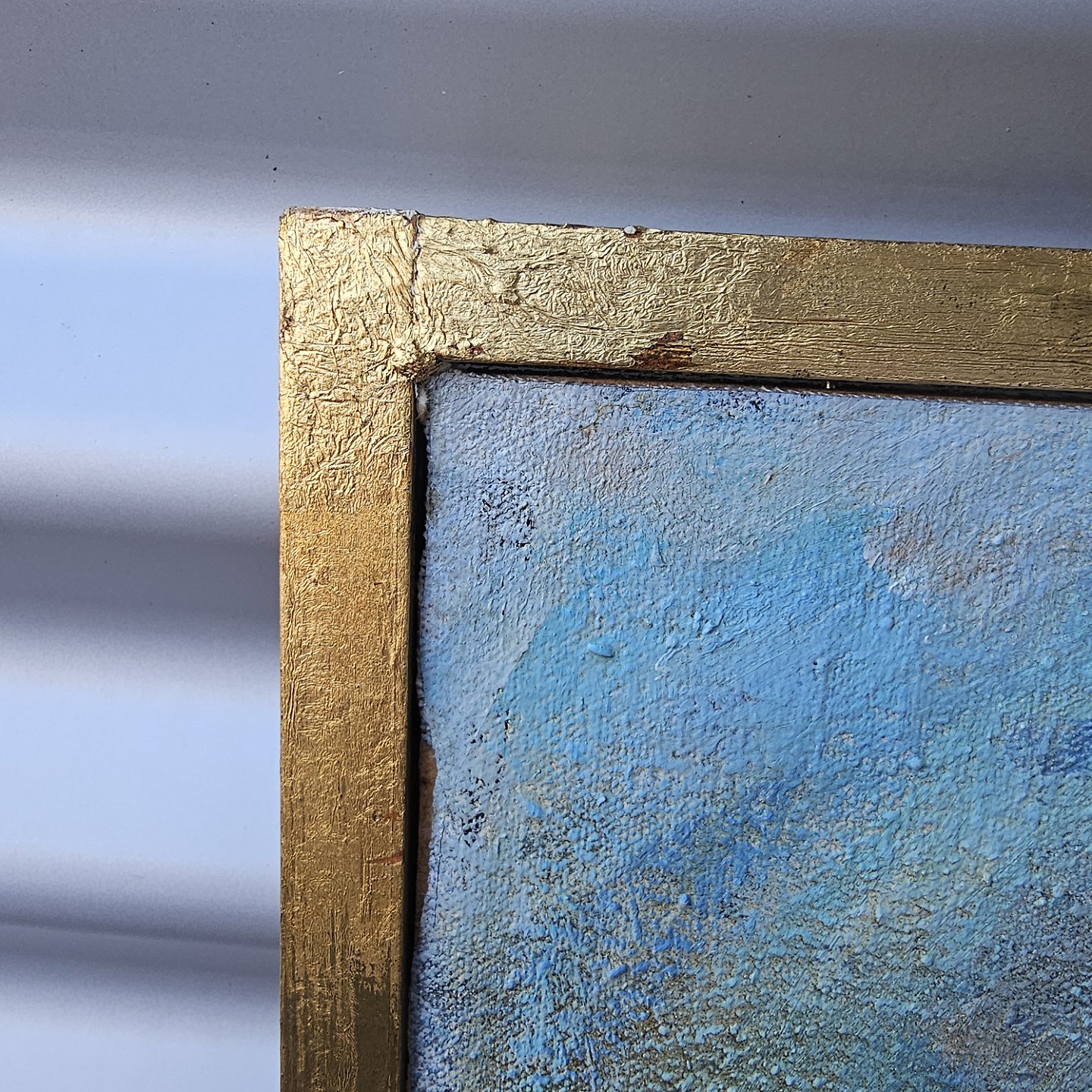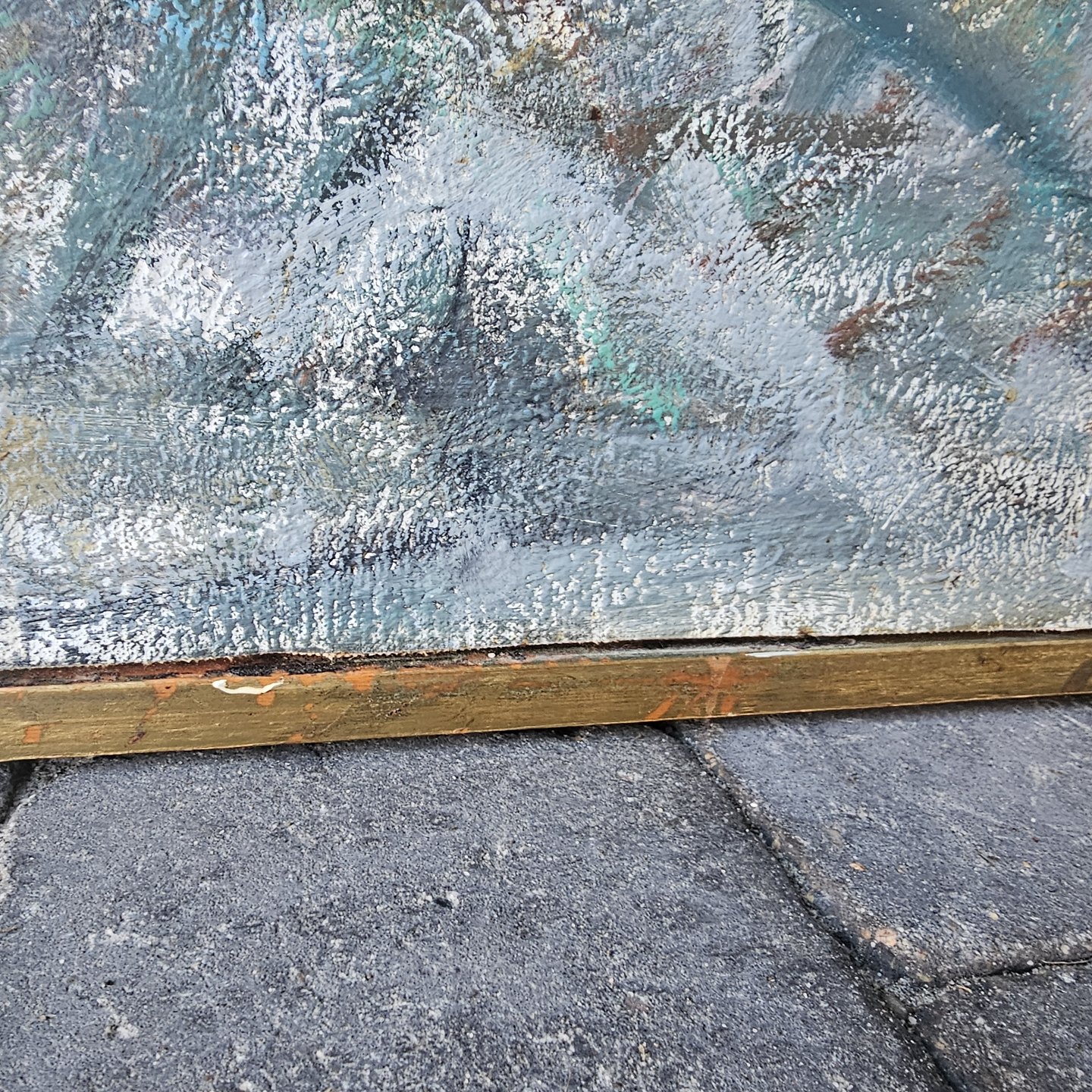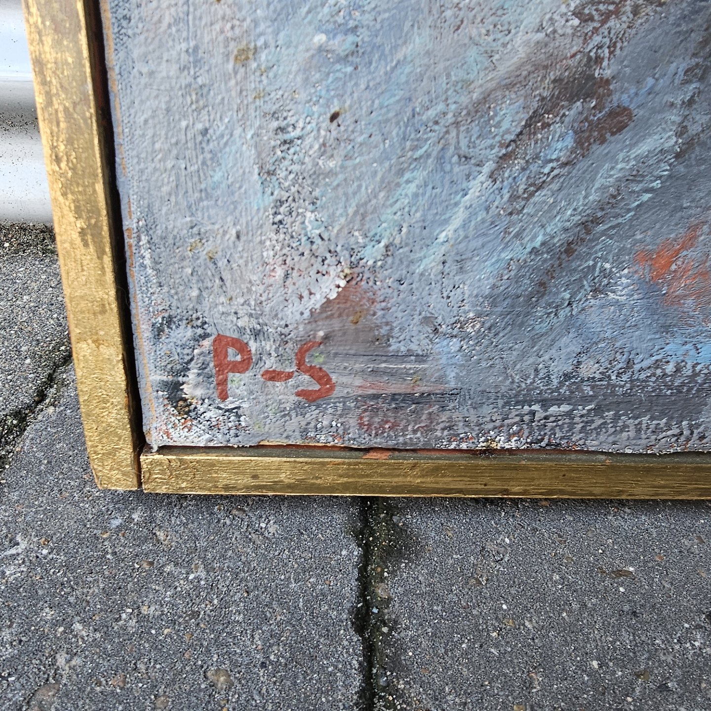 Oliemaleri på plade monteret i guldmalet ramme med motiv af en fisker på havnen i Frederikshavn