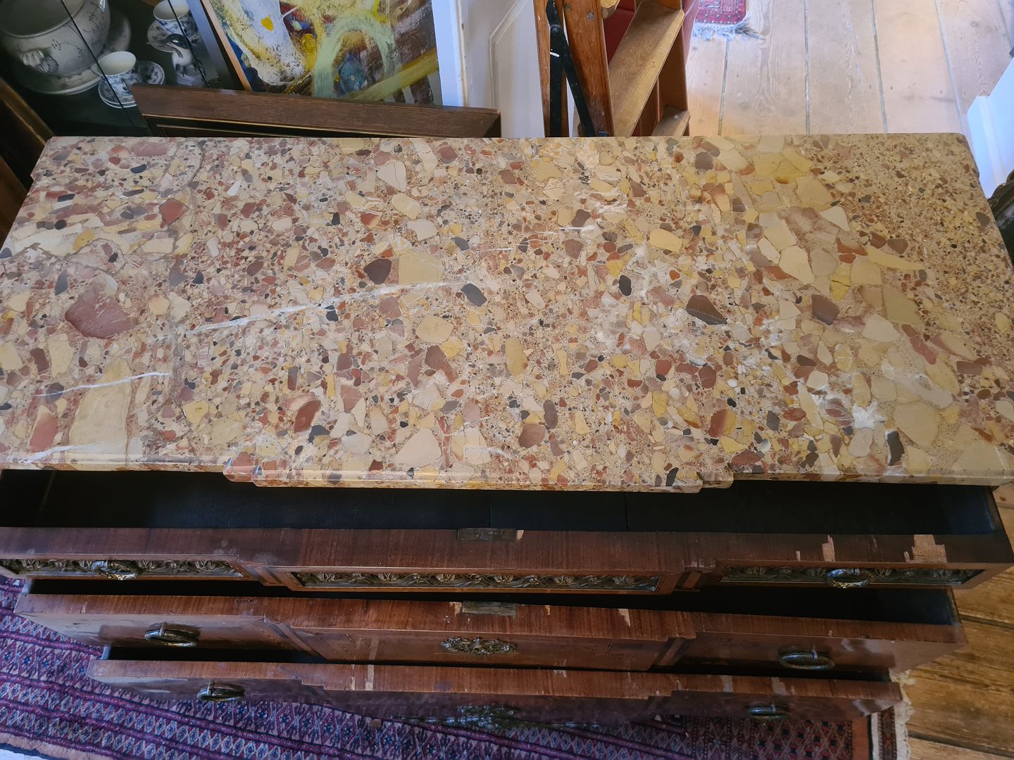 Antik kommode fra sidst i 1800 tallet i rokokostil med løstliggende marmorplade på toppen. Fremstår pæn og funktionsdygtig dog med enkelte finér skader øverst på skufferne (billede) og umiddelbart uden nøgle.