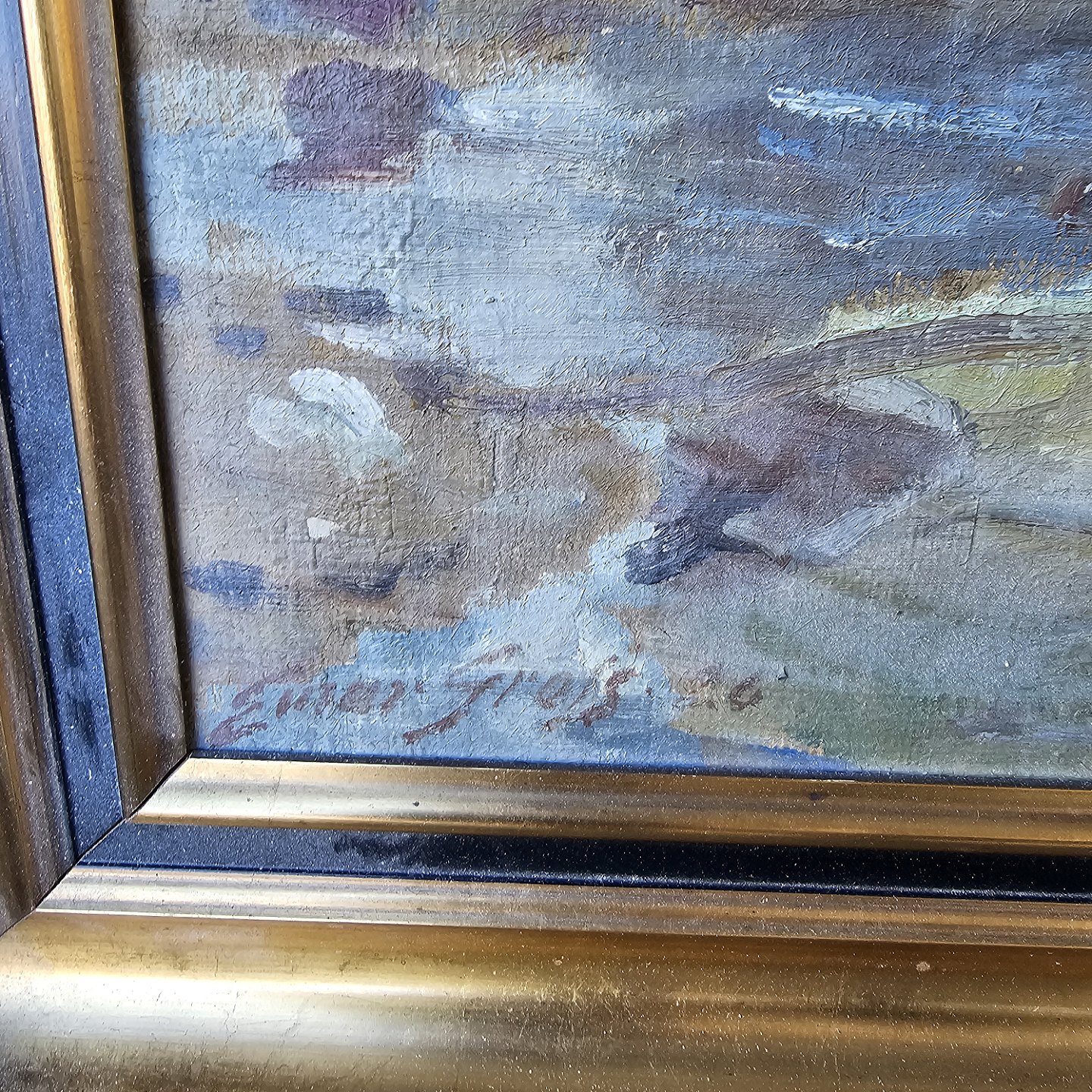 Oliemaleri på lærred monteret i guldramme med motiv af skibe på en strand