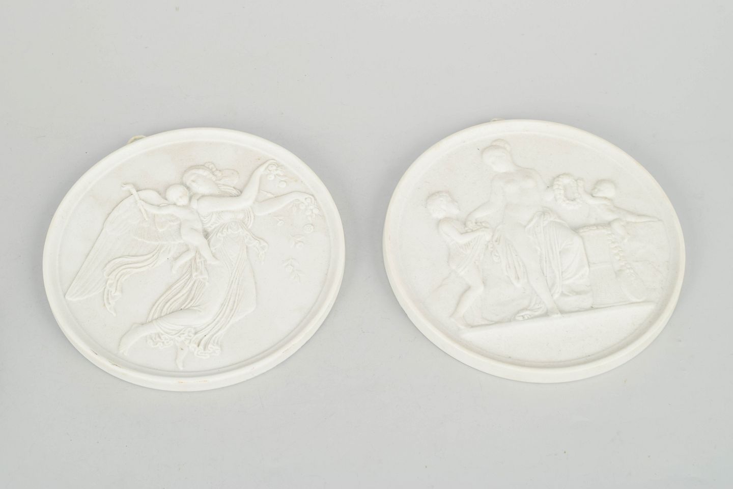 Relieffer i hvidt uglaseret porcelæn med klassiske motiver efter Bertel Thorvaldsen, udført i fin biscuit med detaljeret figurdekoration og ophæng på bagsiden. Første og tredje sortering.