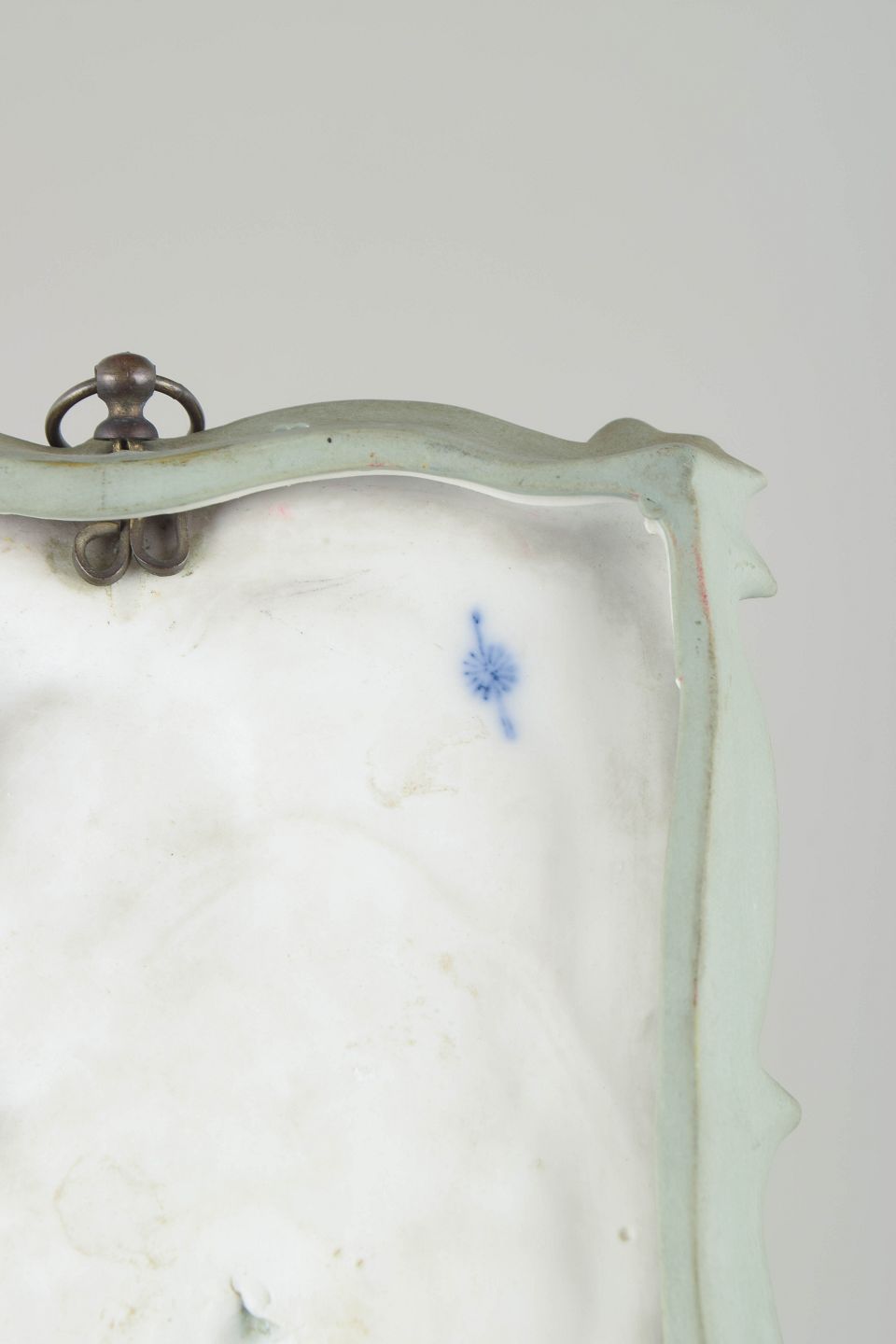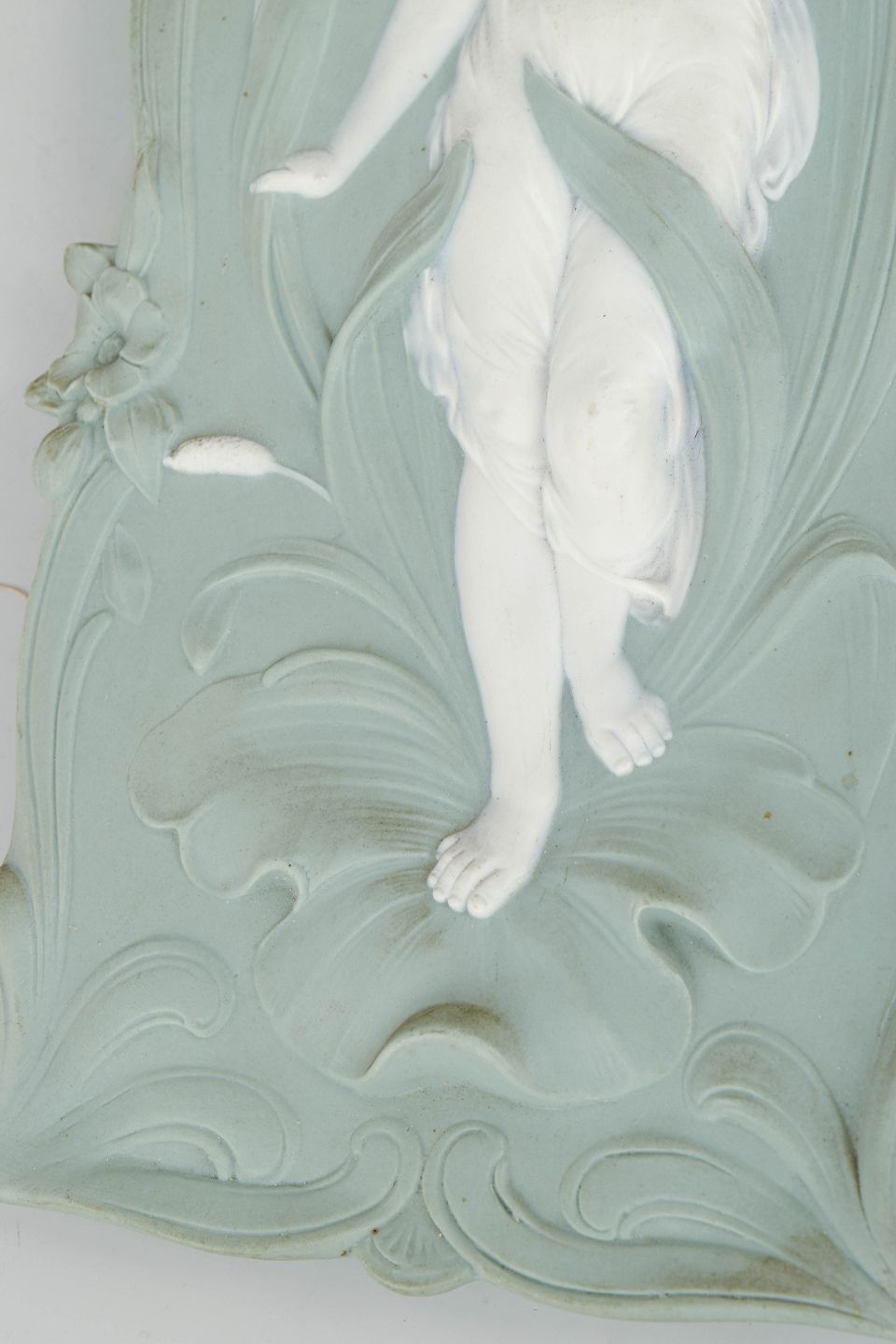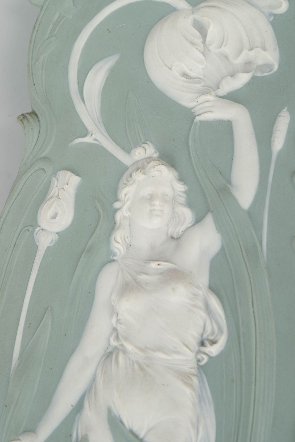 Dekorativt art nouveau vægrelief i lysegrøn jasperware med hvid reliefdekoration forestillende en kvindefigur i bevægelse omgivet af organiske blomsterformer. Fremstillet i biscuitporcelæn med fin detaljering og klassisk jugendstil udtryk. Bagside med ophæng og fabriksmærke.