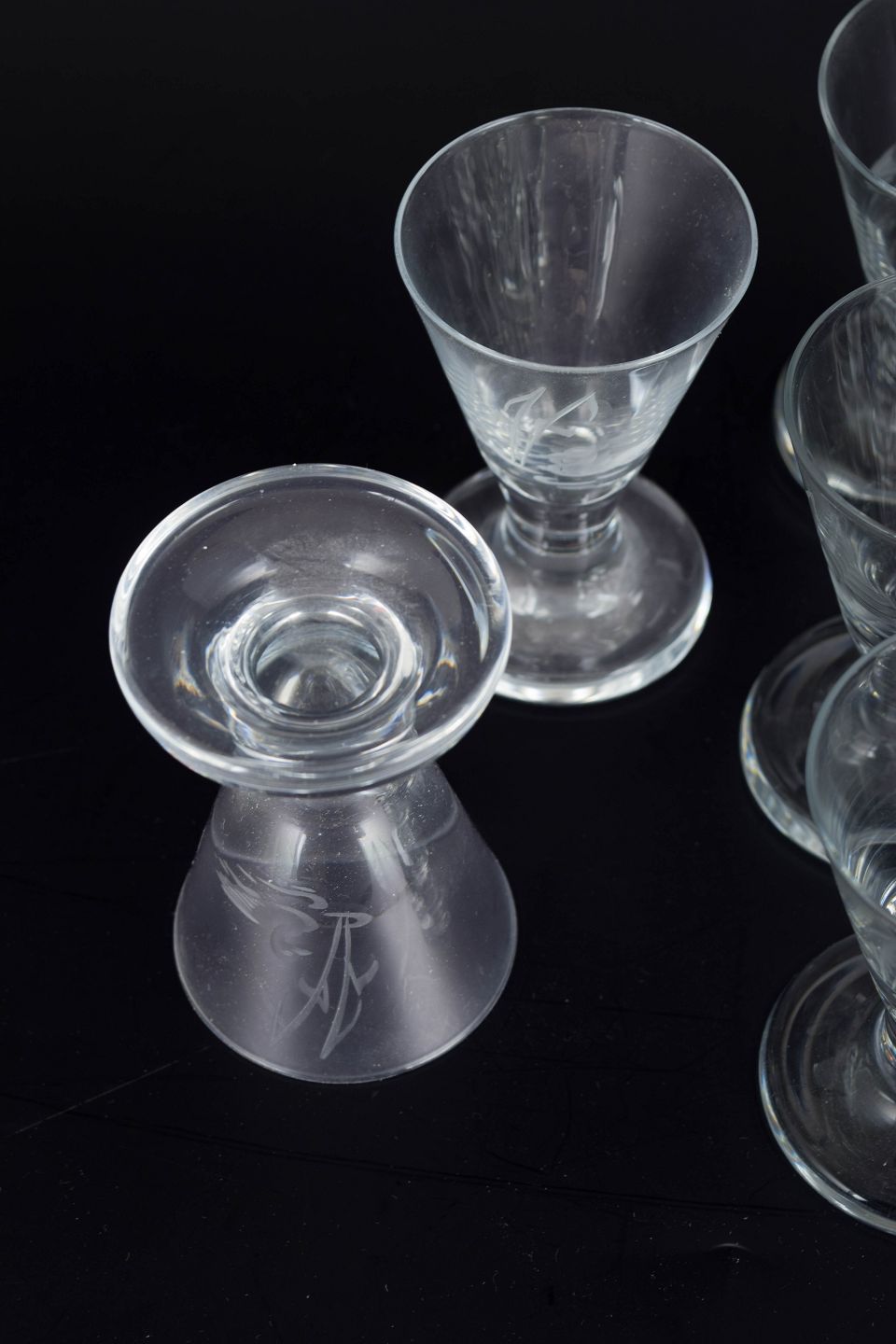 Skandinavisk glasværk, sæt af tolv snaps glas med ande- og sivmotiv.